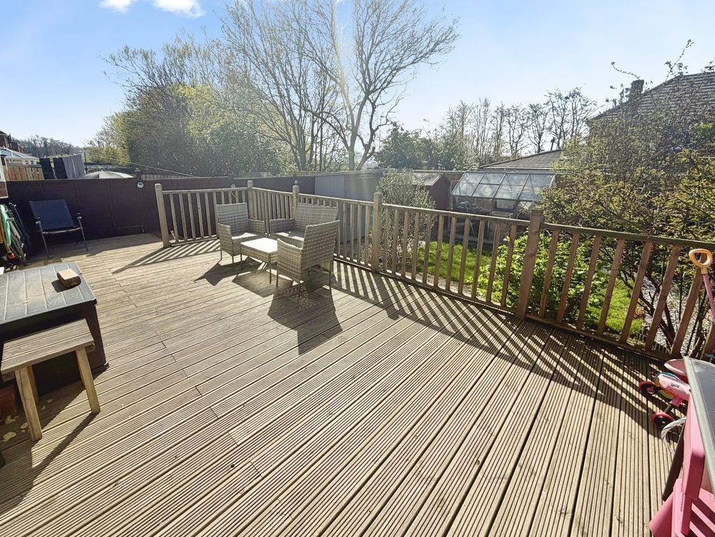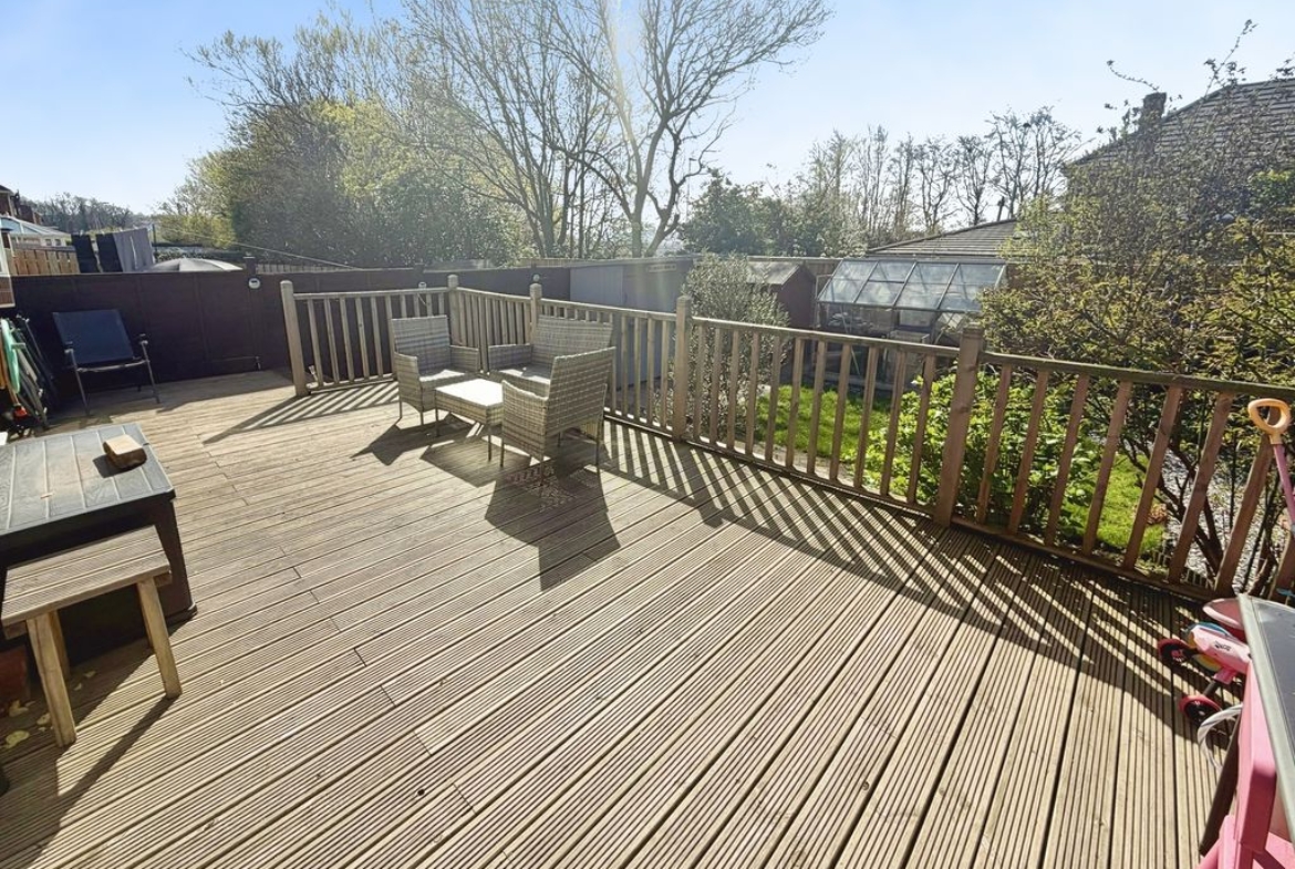 Externally, the home continues to impress. To the front, a large block-paved driveway provides off-street parking for multiple vehicles. The rear garden is enclosed and features a generous decked seating area ideal for outdoor dining, a well-maintained lawn, and mature shrubs that create a private and attractive setting.