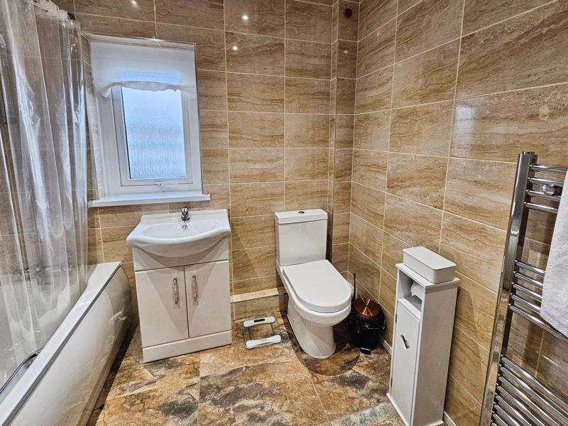 Three piece white suite comprising of; panelled bath with mains shower over, wash hand basin (set in vanity unit), low level wc, spotlights, double glazed window to rear, heated towel rail, tiling to walls and floor.