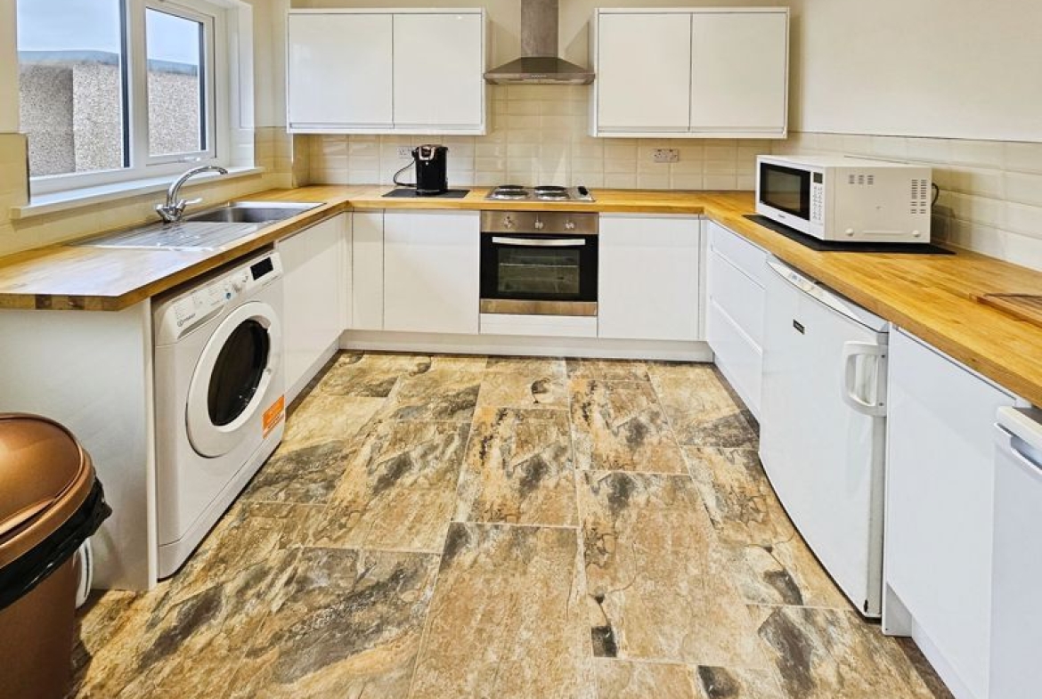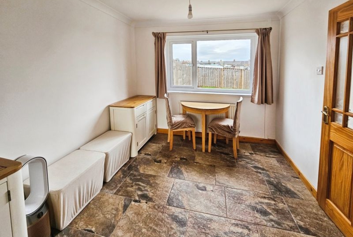 Double glazed window to rear, wall mounted heater, fitted with a range of wall, floor and drawer units with co-ordinating roll edge work surfaces, stainless steel sink unit and drainer with mixer tap, tiled splash backs, built in electric fan assisted oven, electric hob with extractor fan above, space for fridge, plumbed for washing machine, tiling to floor, spotlights, double glazed door to rear.