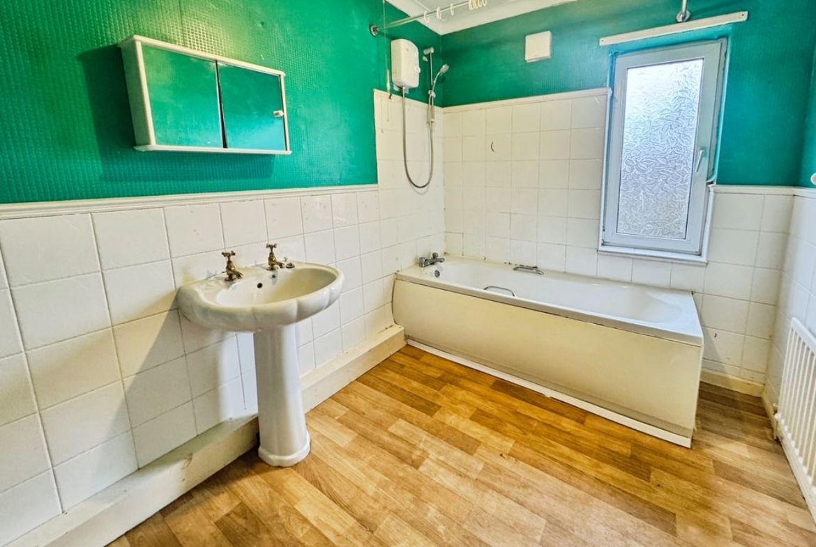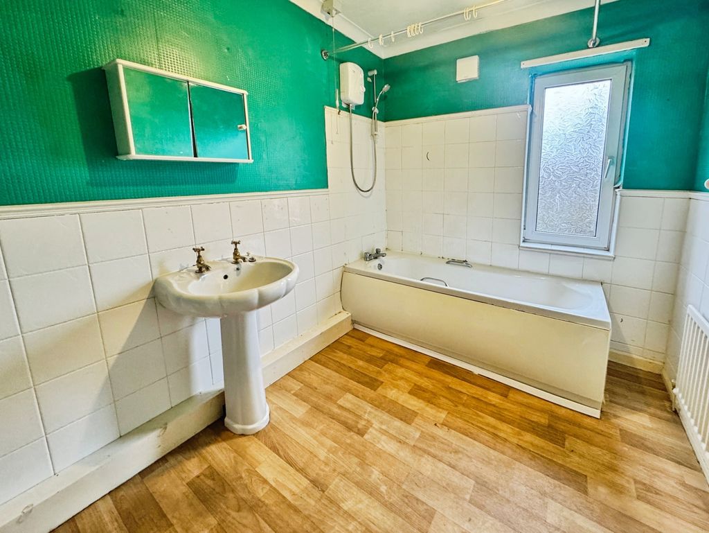 UPVC window, bath with shower, wash hand basin, low level wc, part tiled and radiator.