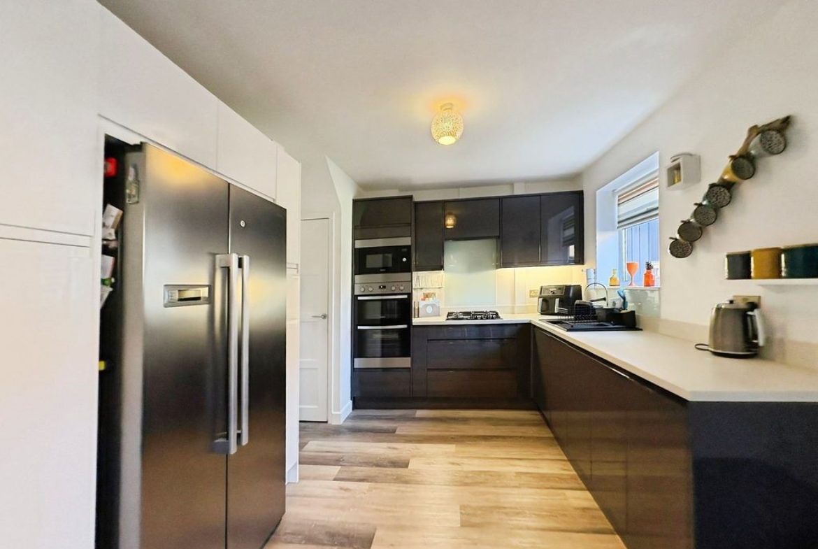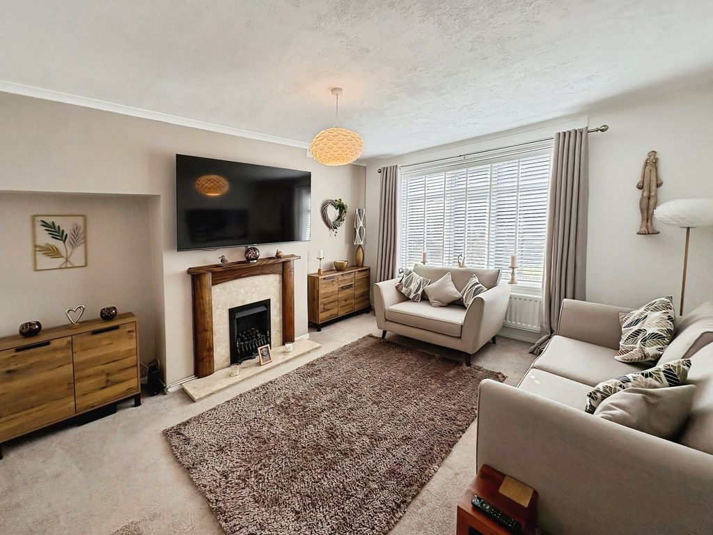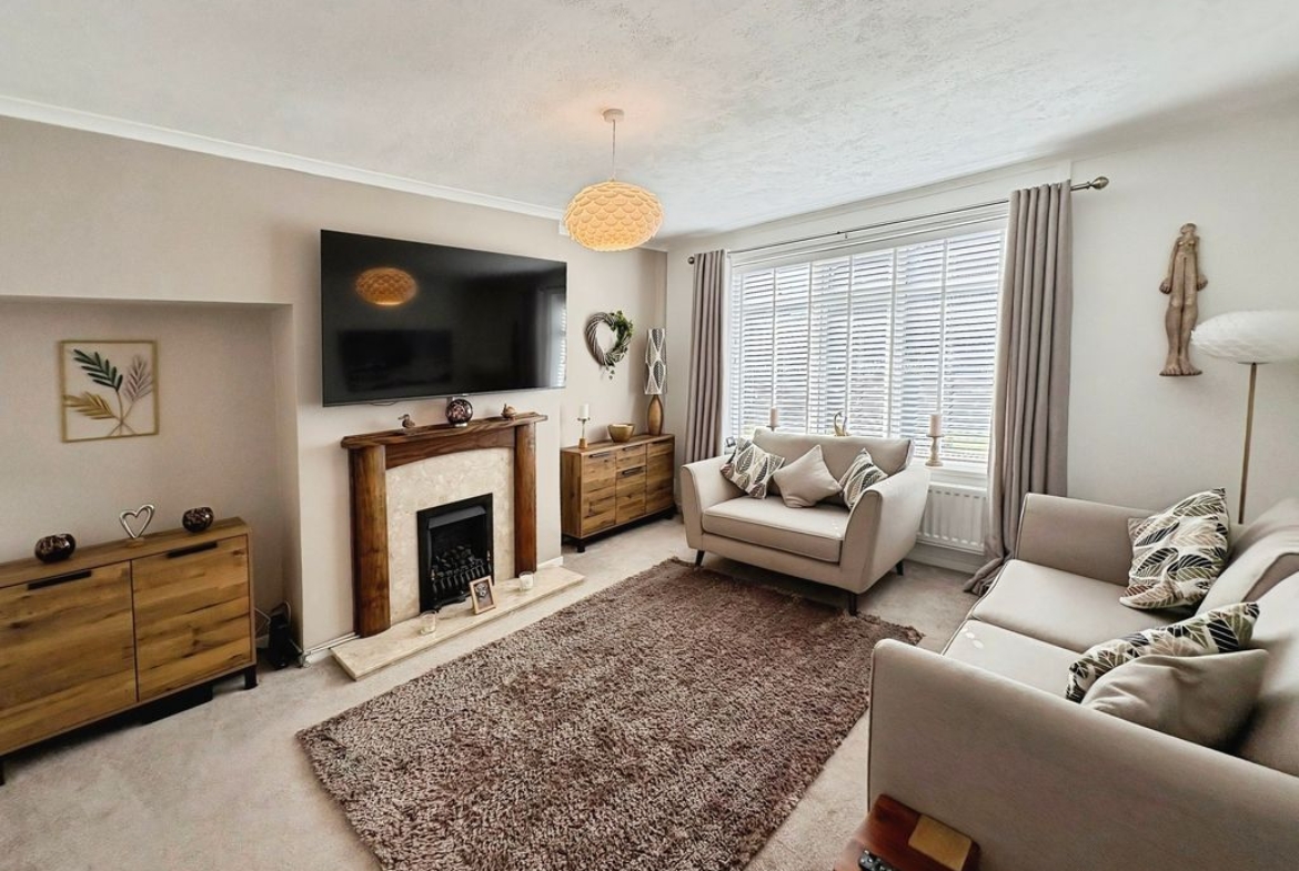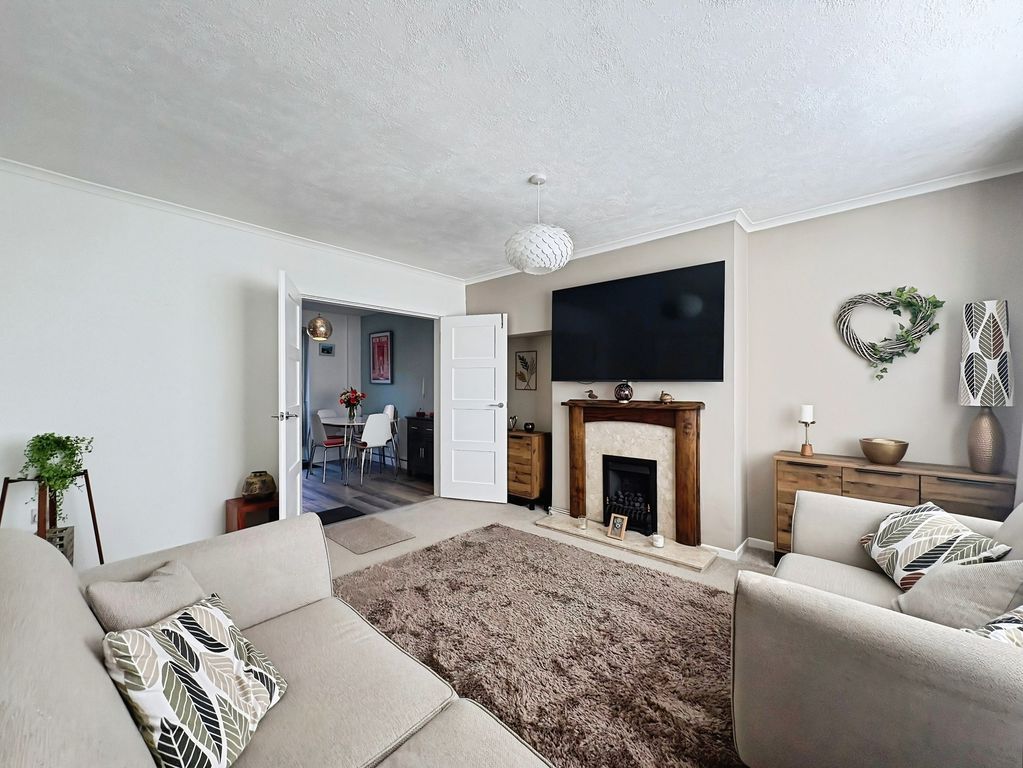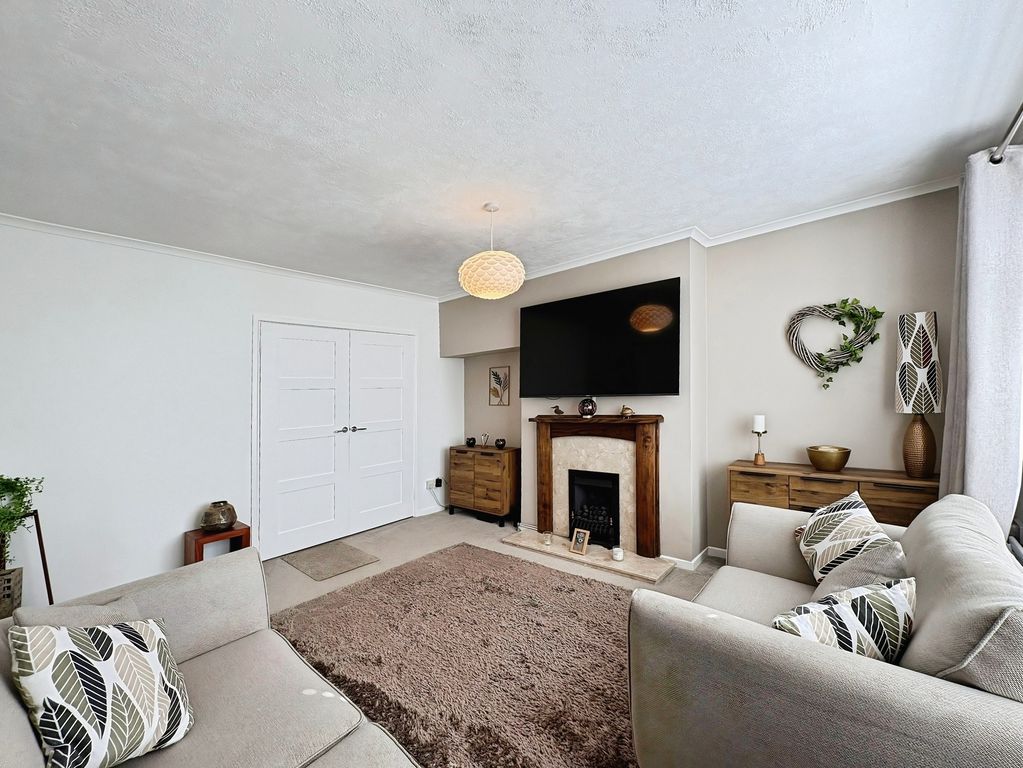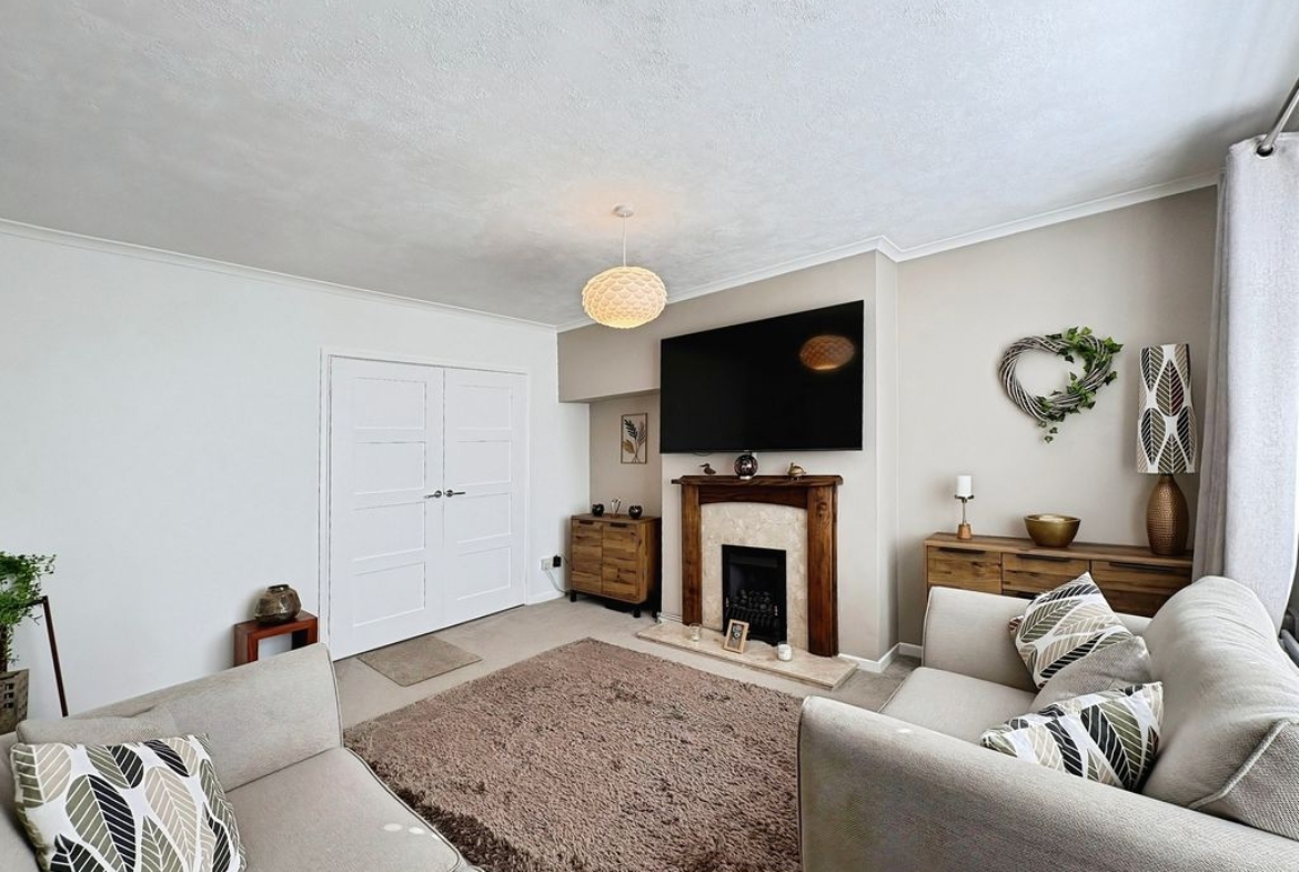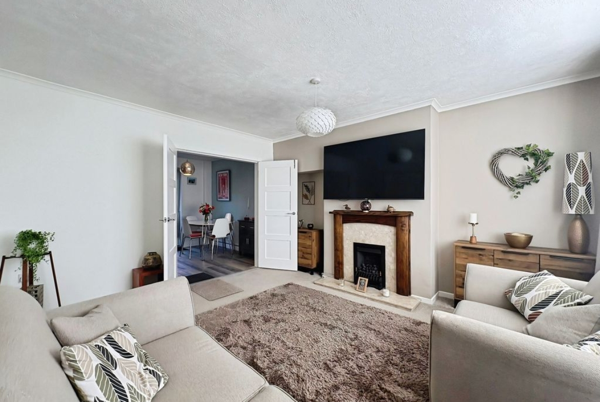 Positioned behind a generous driveway, this well-presented three-bedroom semi-detached home offers a carefully considered layout that combines traditional proportions with a more modern, open-plan rear. The living room sits to the front of the property, a well-balanced and comfortable space centred around a feature fireplace, with a large window drawing in plenty of natural light. From here, the home opens out towards the rear where a substantial dining kitchen that stretches across the width of the house. Designed with both everyday living and entertaining in mind, this space provides a seamless blend of cooking, dining and social areas, finished with contemporary units, integrated appliances and a clean, modern feel throughout. Upstairs, the property continues to impress with three well-proportioned bedrooms. The principal bedroom is particularly generous, complete with extensive fitted wardrobes and built in storage currently utilised as a home office space, while the second bedroom also benefits from built-in storage. A third bedroom offers flexibility as a guest room, office or dressing space. The bathroom has been upgraded to a stylish, modern suite with quality fittings and a sleek finish. Externally, the rear garden offers a great balance of patio and lawn, creating an outdoor space that is ideal for both relaxing and entertaining. Well located for access to local shops, schools and transport links, this is a home that delivers both space and practicality in equal measure, with a layout that feels immediately comfortable and easy to live in.