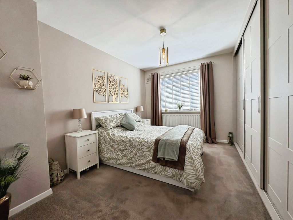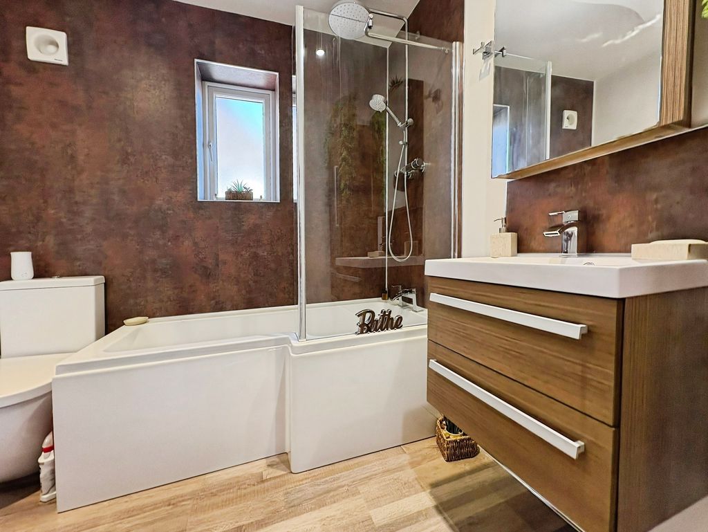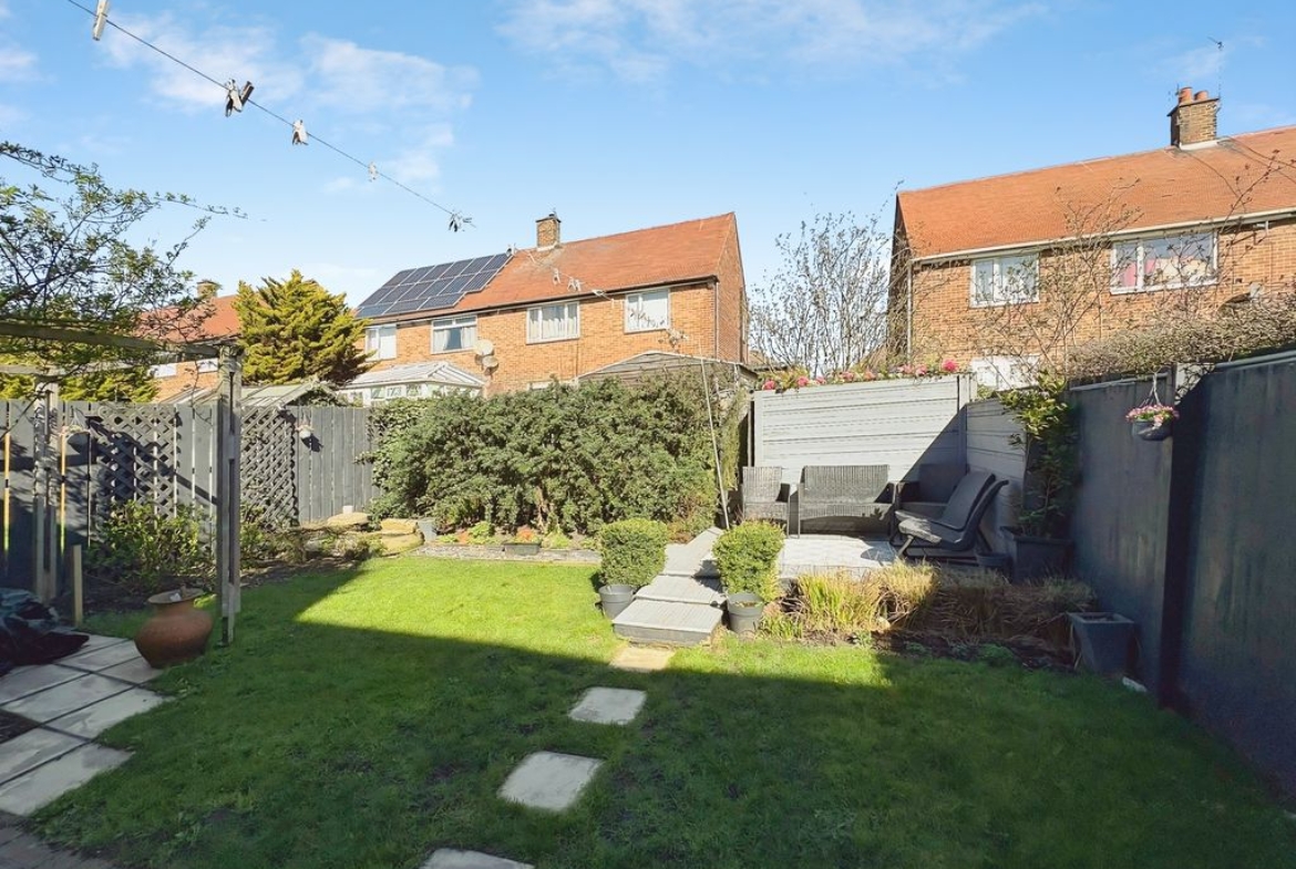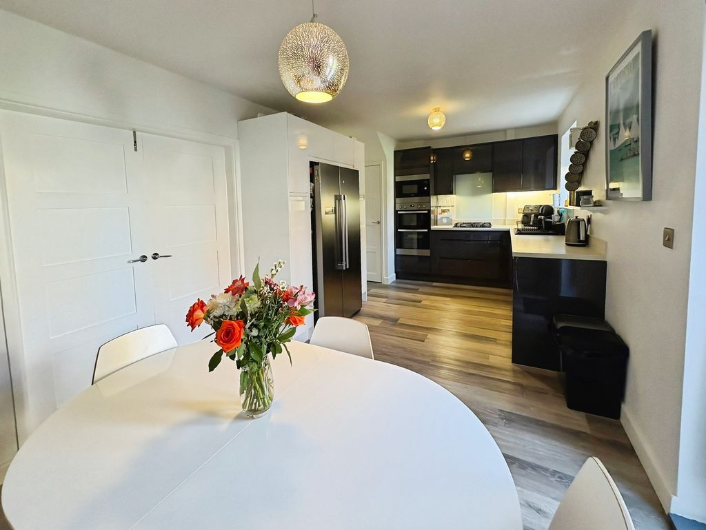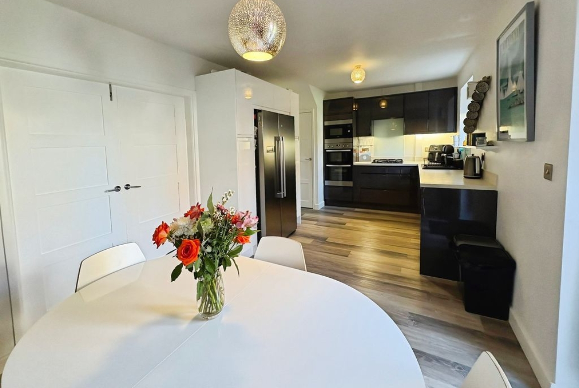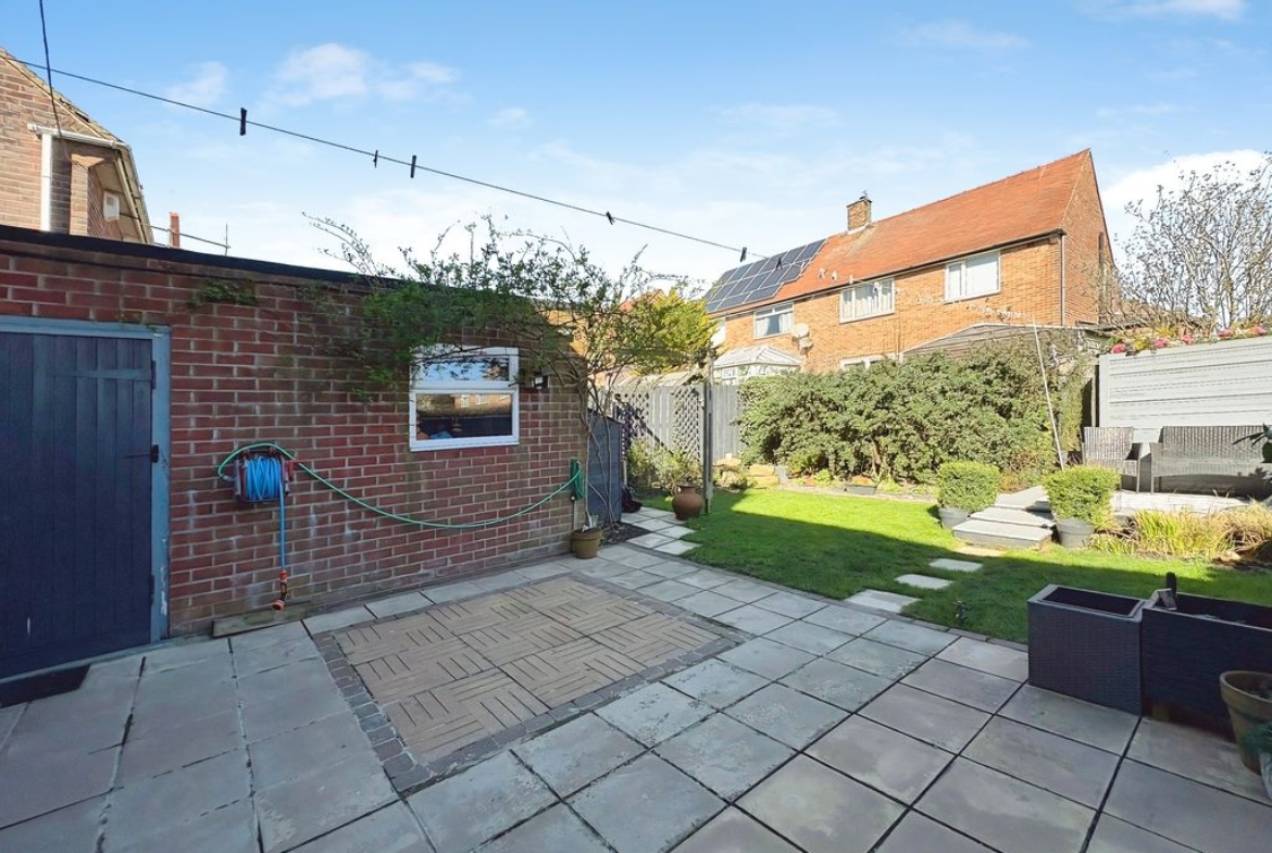 Positioned behind a generous driveway, this well-presented three-bedroom semi-detached home offers a carefully considered layout that combines traditional proportions with a more modern, open-plan rear. The living room sits to the front of the property, a well-balanced and comfortable space centred around a feature fireplace, with a large window drawing in plenty of natural light. From here, the home opens out towards the rear where a substantial dining kitchen that stretches across the width of the house. Designed with both everyday living and entertaining in mind, this space provides a seamless blend of cooking, dining and social areas, finished with contemporary units, integrated appliances and a clean, modern feel throughout. Upstairs, the property continues to impress with three well-proportioned bedrooms. The principal bedroom is particularly generous, complete with extensive fitted wardrobes and built in storage currently utilised as a home office space, while the second bedroom also benefits from built-in storage. A third bedroom offers flexibility as a guest room, office or dressing space. The bathroom has been upgraded to a stylish, modern suite with quality fittings and a sleek finish. Externally, the rear garden offers a great balance of patio and lawn, creating an outdoor space that is ideal for both relaxing and entertaining. Well located for access to local shops, schools and transport links, this is a home that delivers both space and practicality in equal measure, with a layout that feels immediately comfortable and easy to live in.