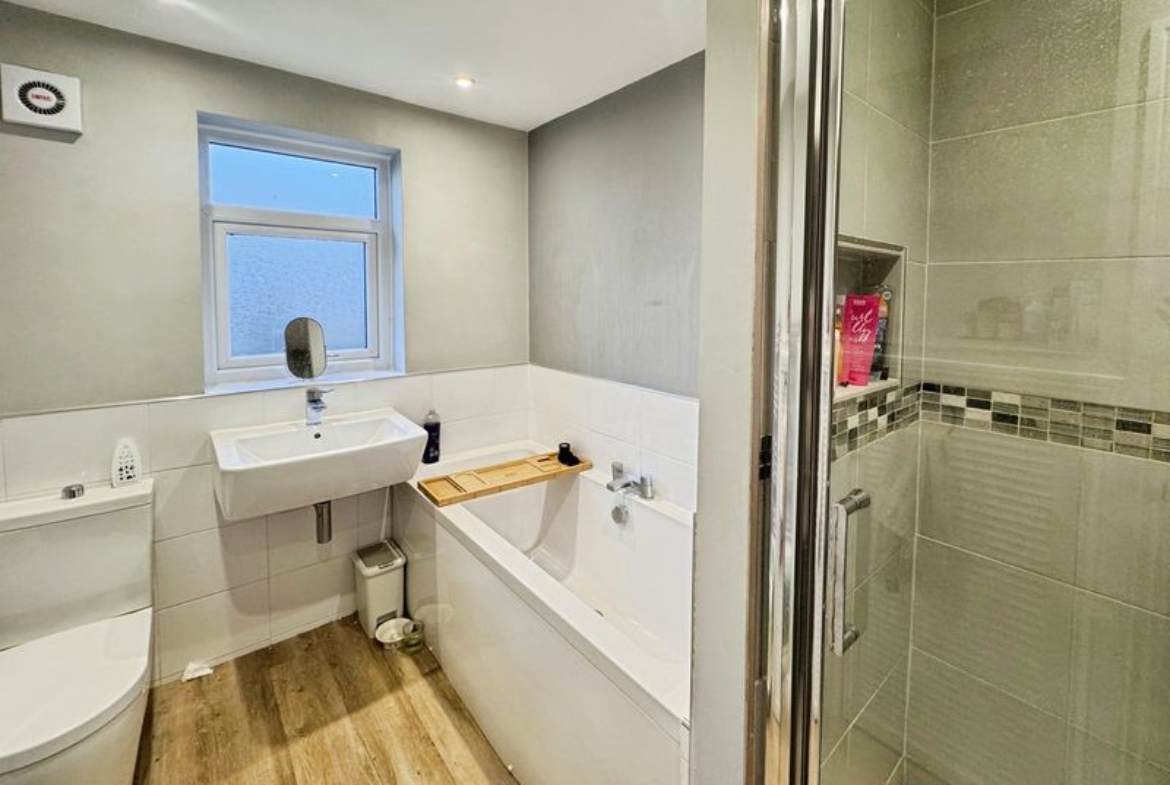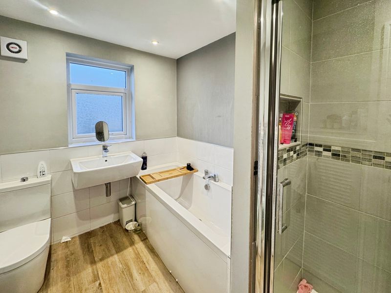 UPVC window, bath, shower, low level wc, wash hand basin, part tiled and heated towel rail.