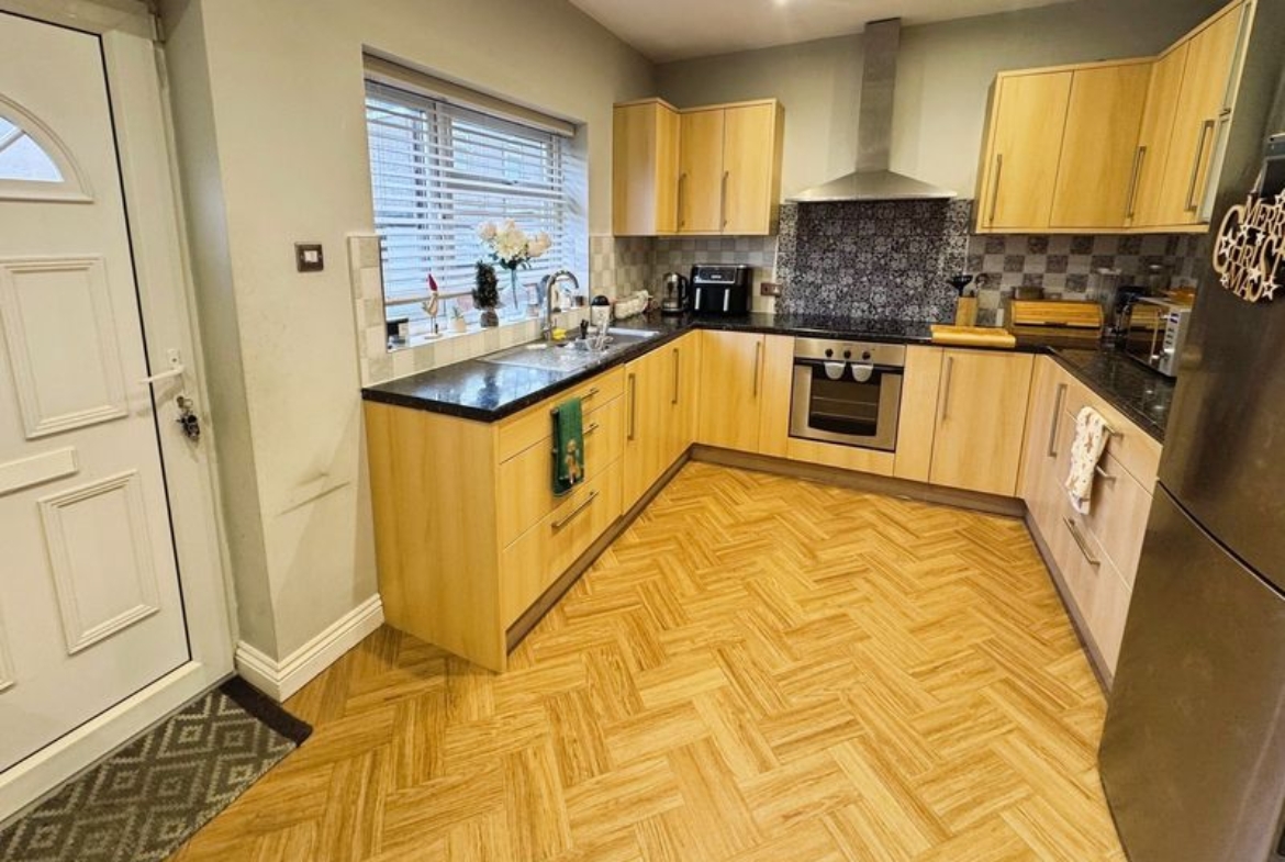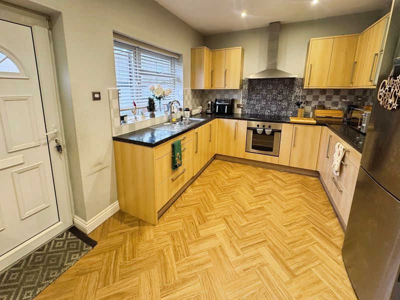 Two UPVC windows, UPVC door, fitted with a range of matching wall and base units incorporating one and a half bowl sink unit with drainer, integrated electric oven and hob, plumbed for washing machine, dining space and radiator.