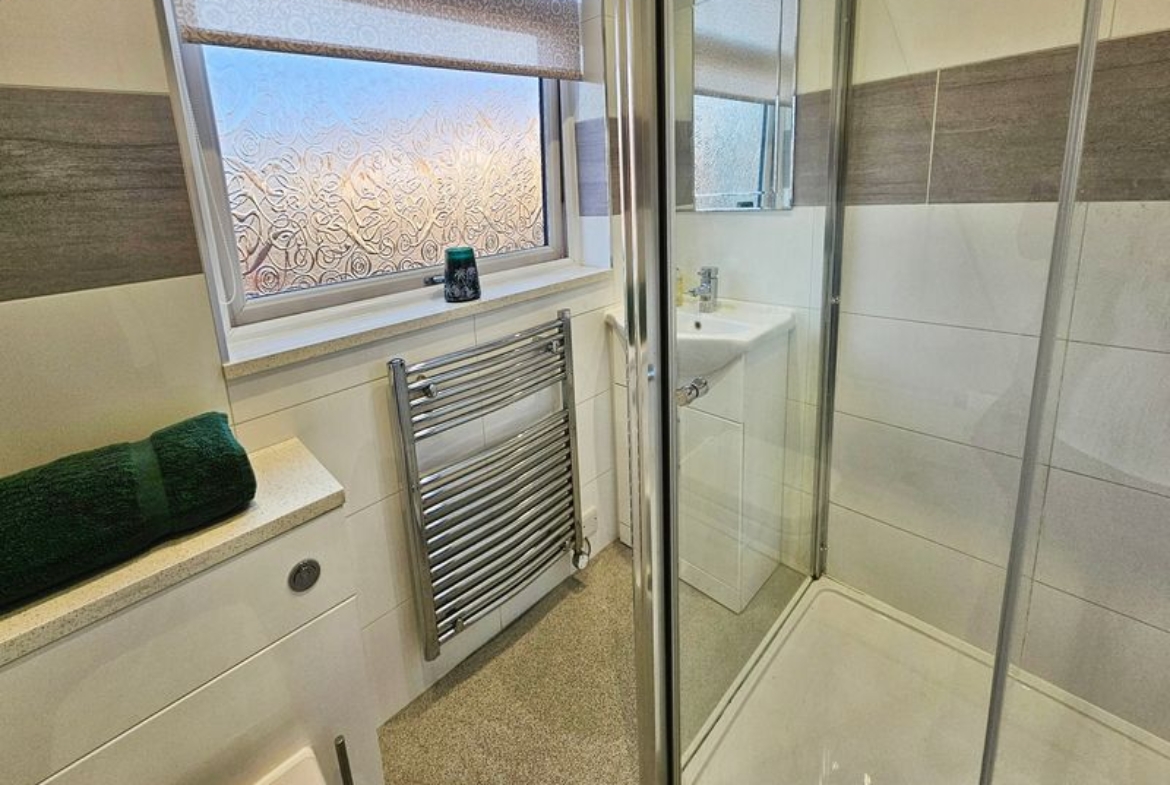Three piece white suite comprising; shower cubicle (electric shower), wash hand basin (set in vanity unit), shower cubicle, low level wc, spotlights, double glazed window to rear, heated towel rail, vinyl flooring, tiled walls, extractor fan.