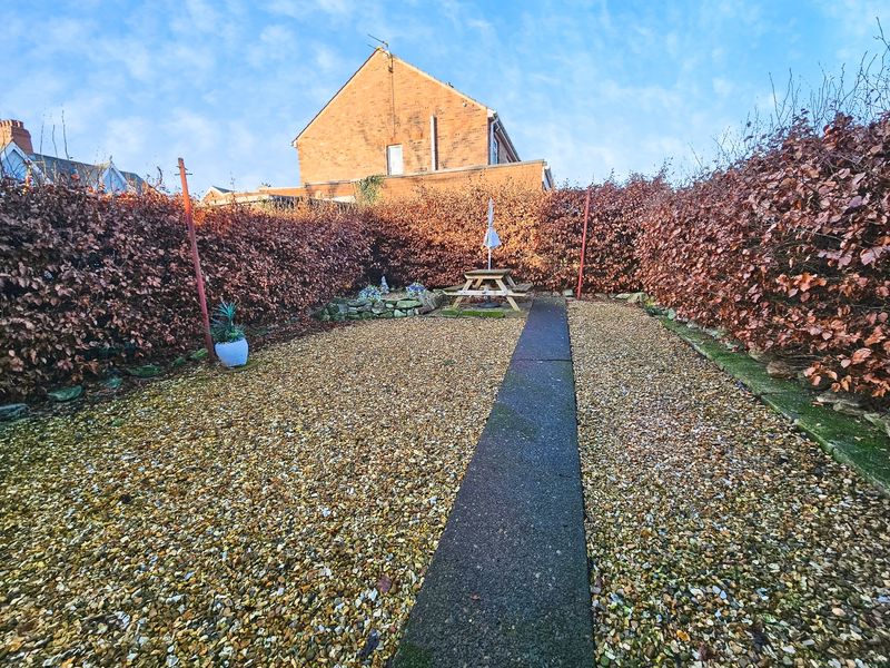 Low maintenance garden to the rear, flower beds, bushes and shrubs, gravelled area.