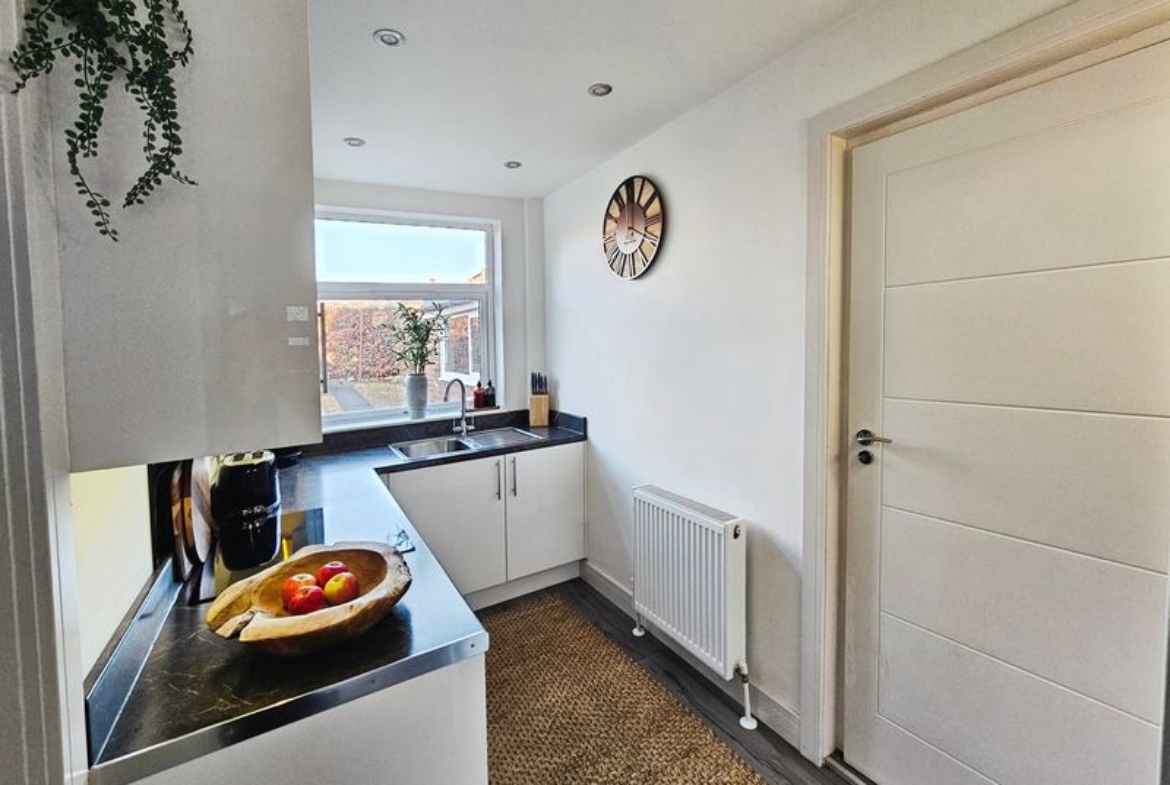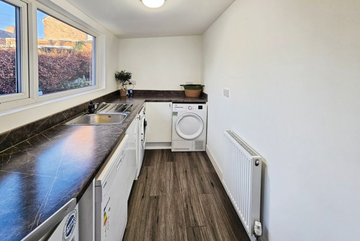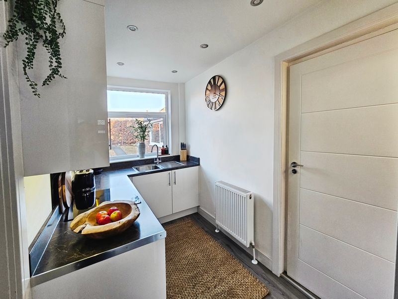 Double glazed window to side, fitted base units and work surface, stainless steel sink unit with mixer taps, plumbed for washing ,machine, double radiator, tiled flooring.