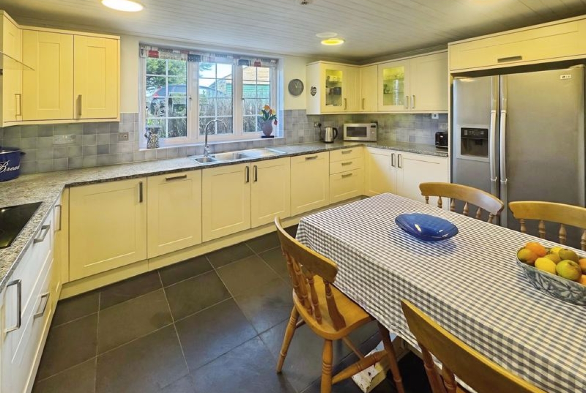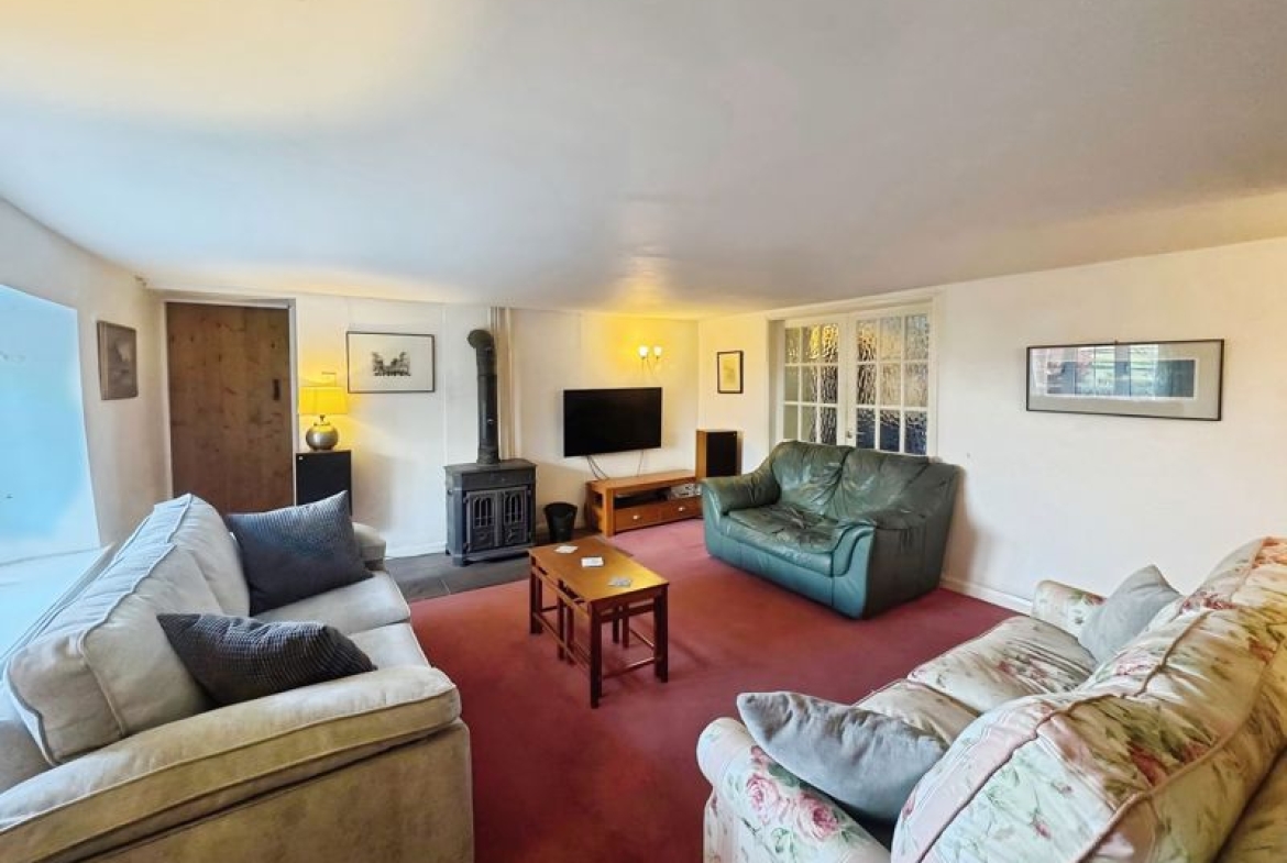 The front door leads into the entrance lobby with composite double glazed entrance door, window to front elevation and plenty of space for cloaks hanging. A further door leads into the open plan lounge with multi-fuel burning stove, large picture window to the south and doors to kitchen, dining room and the third reception room (fifth bedroom).