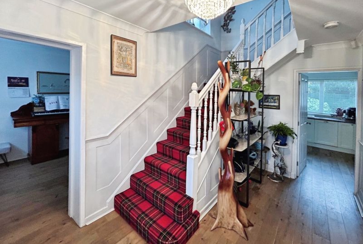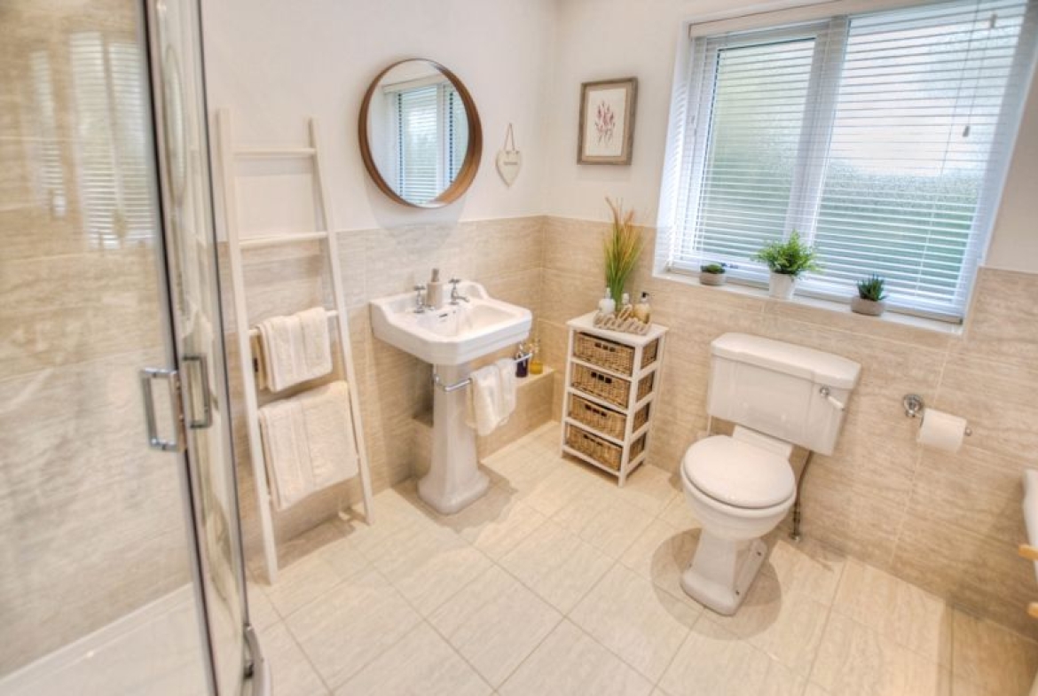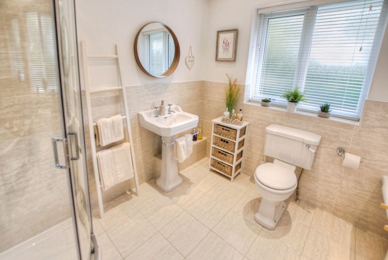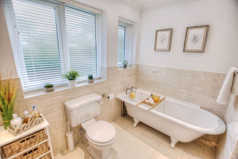 Upstairs, there are three well-proportioned bedrooms, with the master bedroom benefiting from fitted wardrobes. The luxurious family bathroom offers a four-piece suite with separate shower and freestanding roll-top bath.