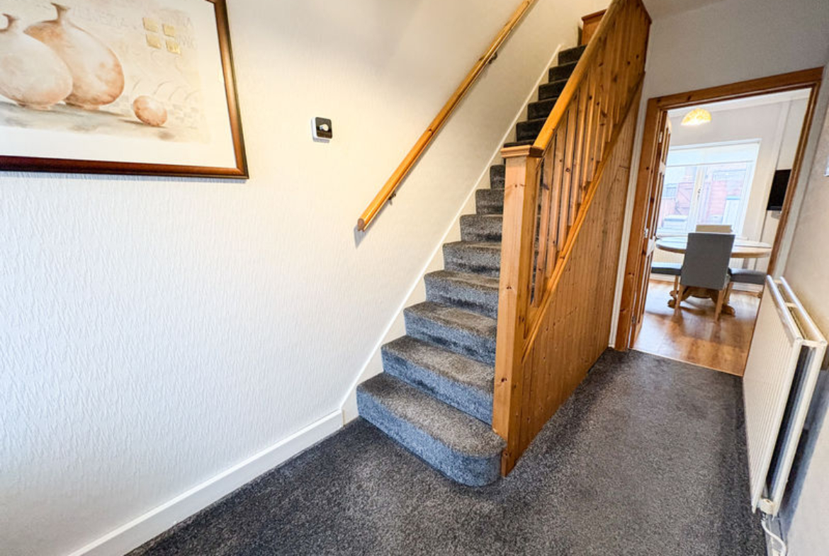 ENTRANCE HALLWAY: stairs to first floor landing, double radiator and storage cupboard.