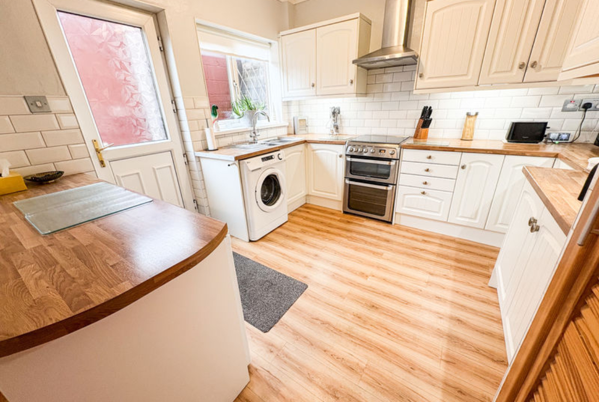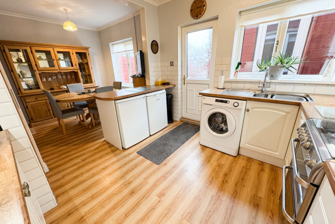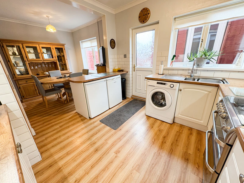 KITCHEN: (rear): 19’0 x 9’66, (5.79m x 2.94m),double glazed window to rear, double radiator, range of wall, floor and drawer units with coordinating roll edge work surfaces, tiled splash backs, space for cooker And fridge freezer , plumbed area for washing machine, and coving to ceiling as well as double glazed door to rear yard and storage cupboard..