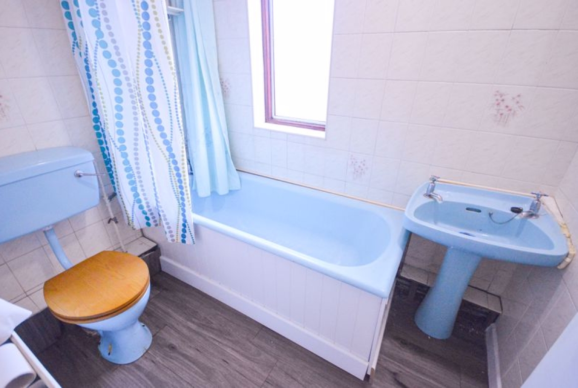 3 piece suite comprising: Shower over panelled bath, hand basin, low level WC, double glazed window to side, single radiator