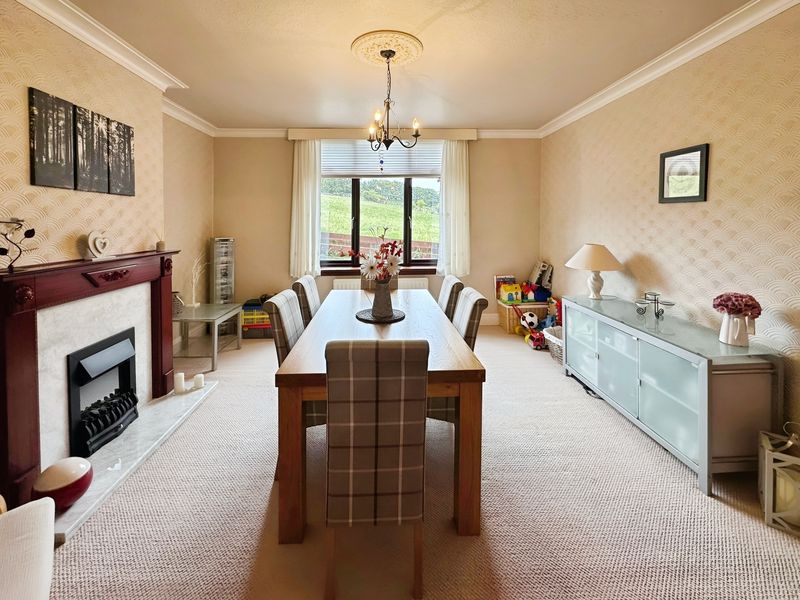 The dining room is another spacious room with large picture window to the rear overlooking the fields and views beyond. Offering space enough for a family dining set as well as other furniture and another feature fireplace, this is a great room with a range of uses.