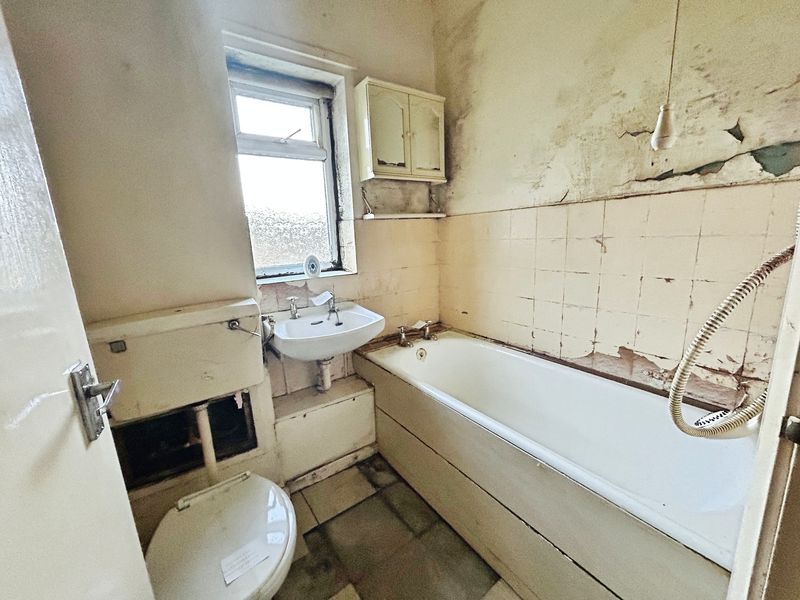 Briefly comprising; low level W.C., pedestal wash hand basin, panelled bath, UPVC double glazed frosted window to rear, radiator.