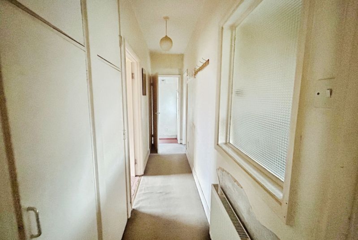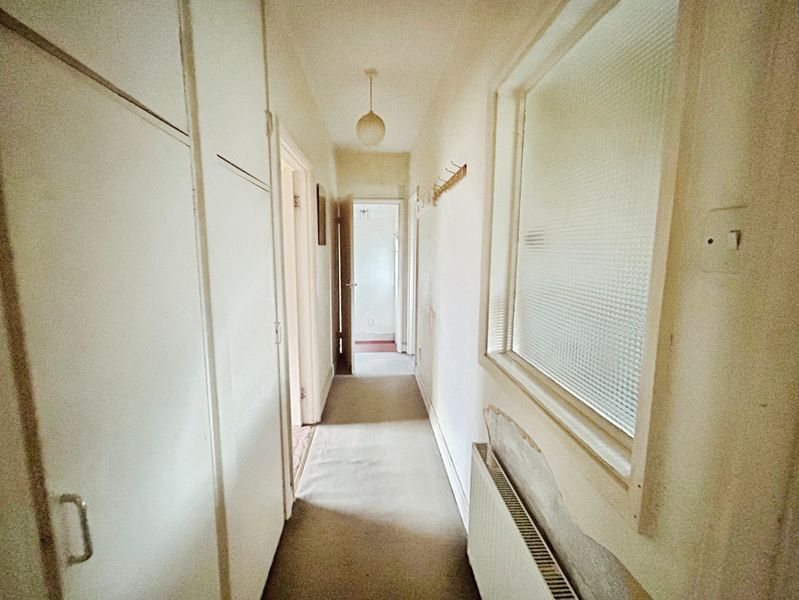 HALLWAY: Radiator, frosted glazed window to kitchen, four door storage cupboards housing combination boiler and meters, access to loft space.