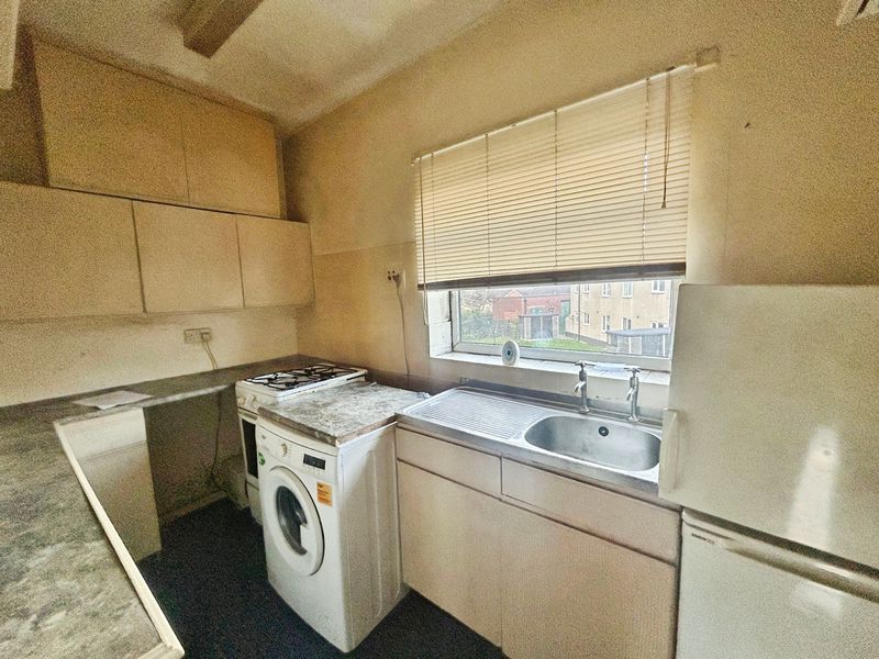 Built in wall and base units with work surfaces incorporating a single drainer sink unit, UPVC double glazed window to rear, space for free standing washing machine, space for free standing cooker, frosted window to hallway.