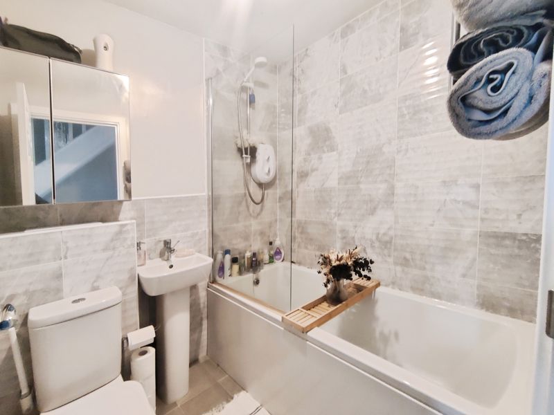 Bathroom 5.95ft x 5.56ft (1.81m x 1.69m) Three piece white suite comprising of panelled bath with electric shower over, pedestal wash hand basin, low level wc, single radiator, part tiling to walls, extractor fan.