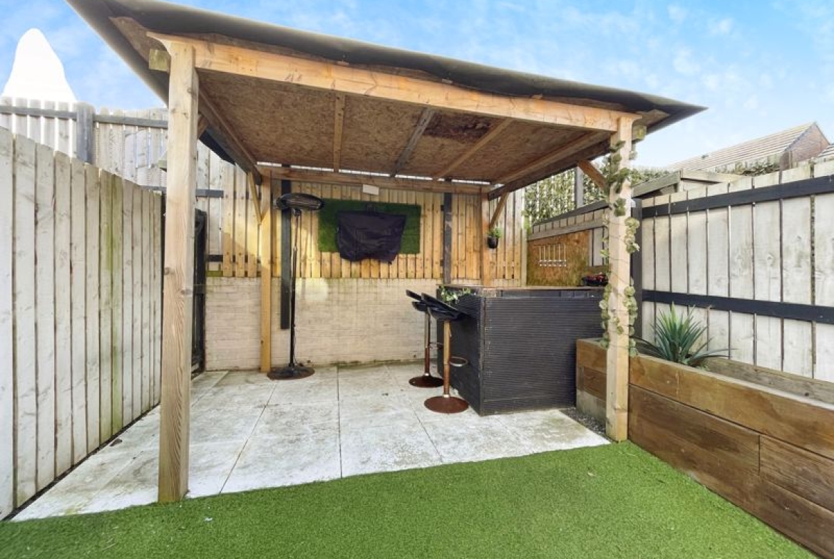 The front of the property offers a designated parking spot with further parking available to the front and on street. The rear garden is fully fenced and enclosed and is of a sunny aspect. There is a nicely placed covered wooden gazebo area at the far end of the garden and some attracting wooden planters.