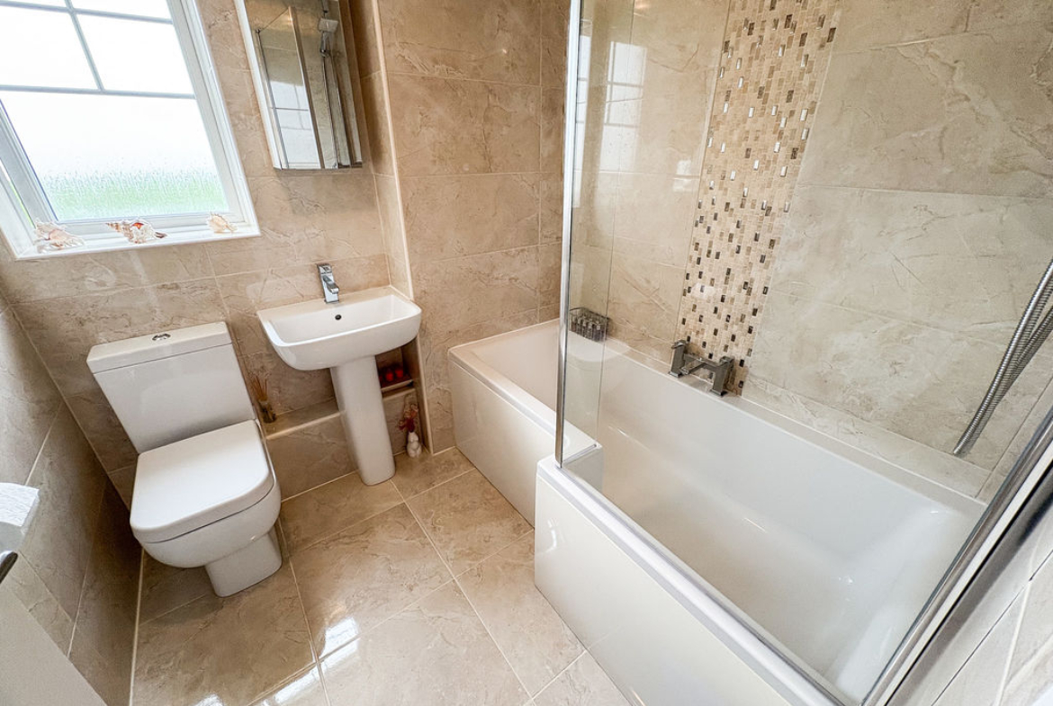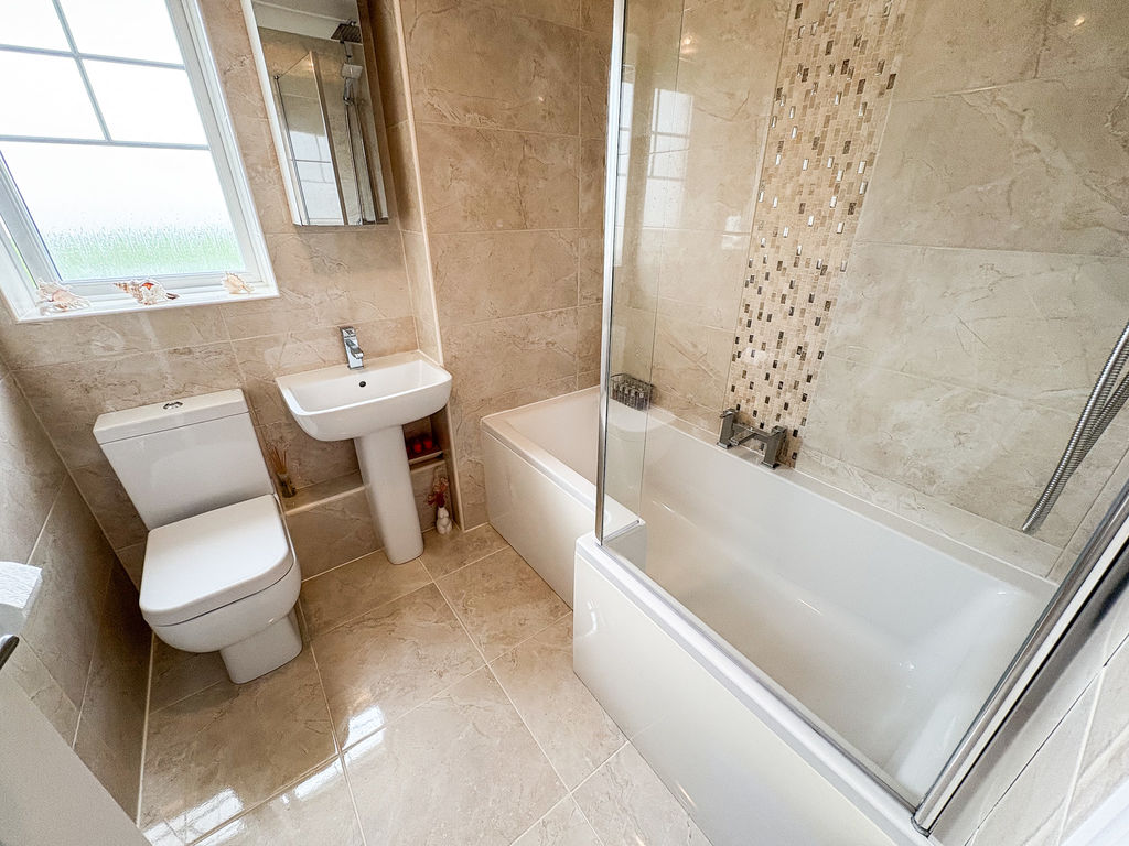 FAMILY BATHROOM: white three piece suit comprising L-shape bath, pedestal wash hand basin, low level WC, tiling to walls and floors, radiator, extractor fan, and double glazed frosted window to front.