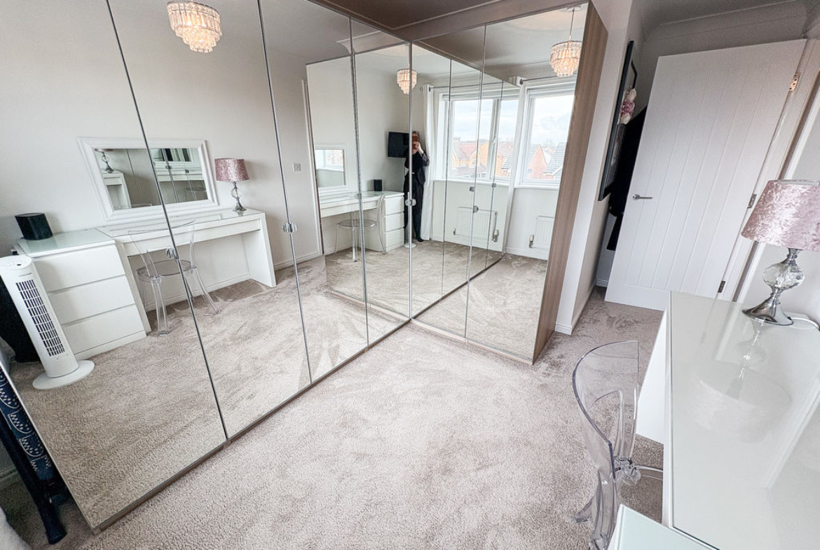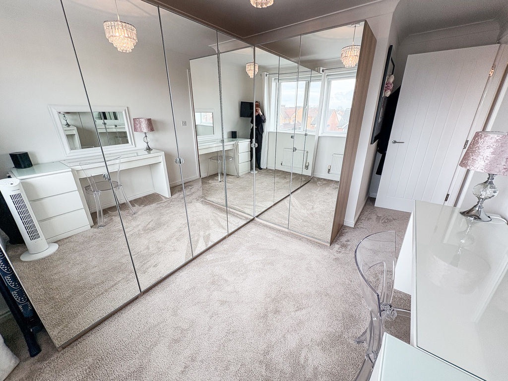 BEDROOM ONE: (front): 14’02 x 9’05, (4.27m x 2.14m), double glazed window to rear, fitted mirrored wardrobes and radiator.
