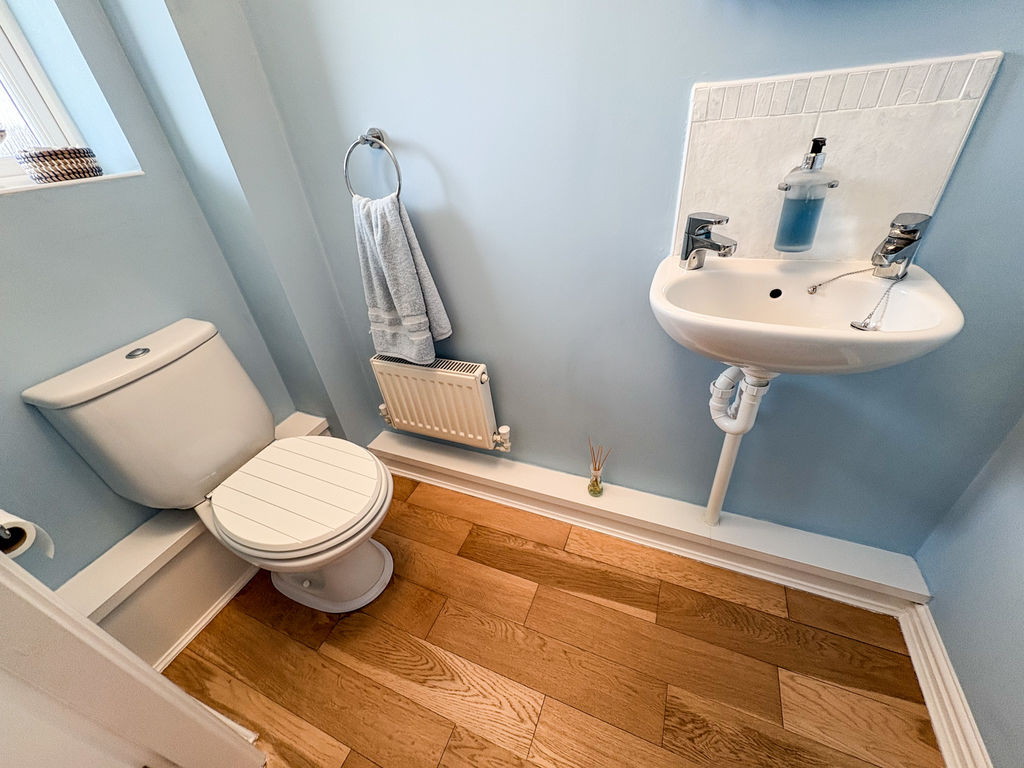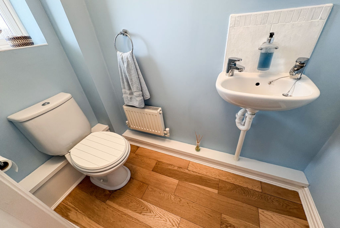 DOWNSTAIRS CLOAKS/W.C.: Double glazed window to front, low level w.c, wash hand basin, a radiator, and under stairs cloak cupboard.