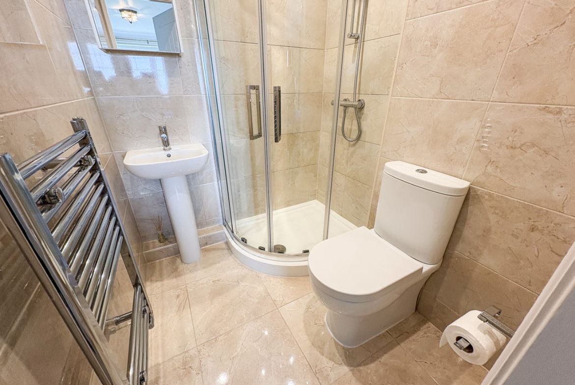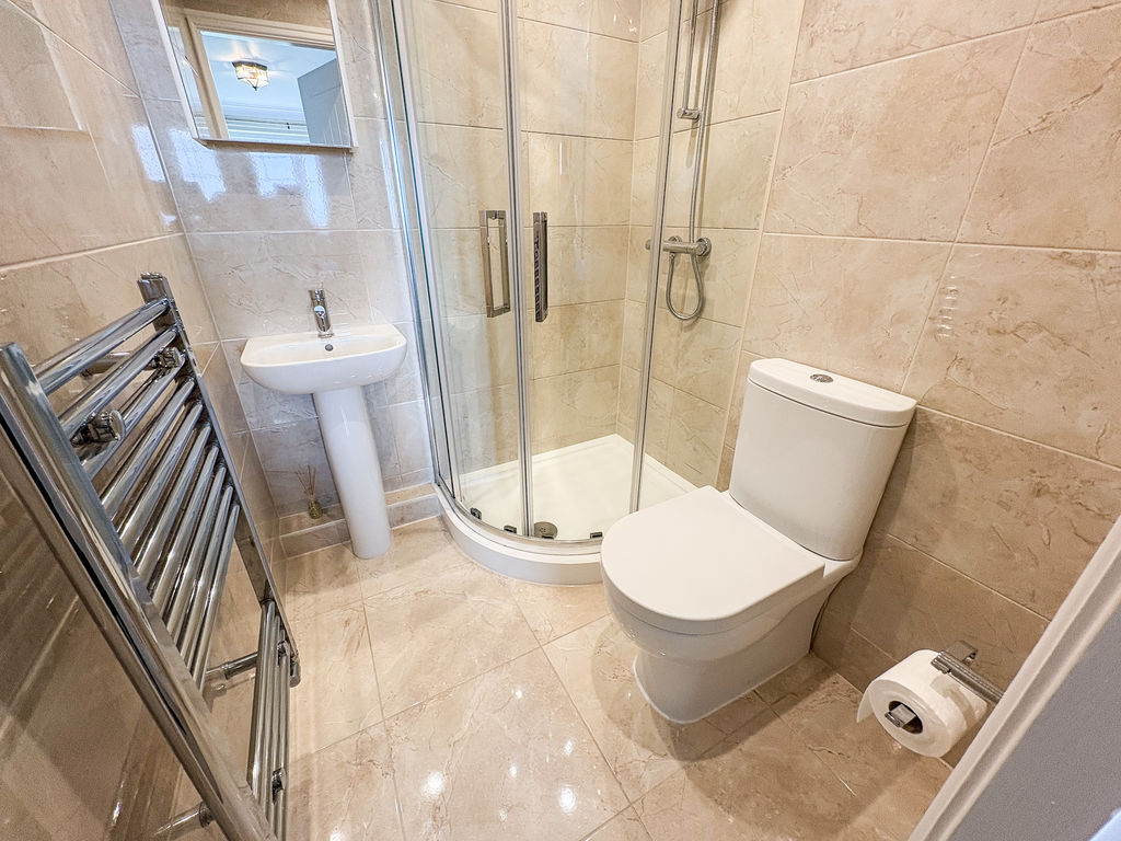 EN-SUITE SHOWER ROOM: white three piece suite comprising pedestal wash hand basin, step in shower cubicle with mains shower, low level WC, tiled walls and dolor as well as extractor fan.
