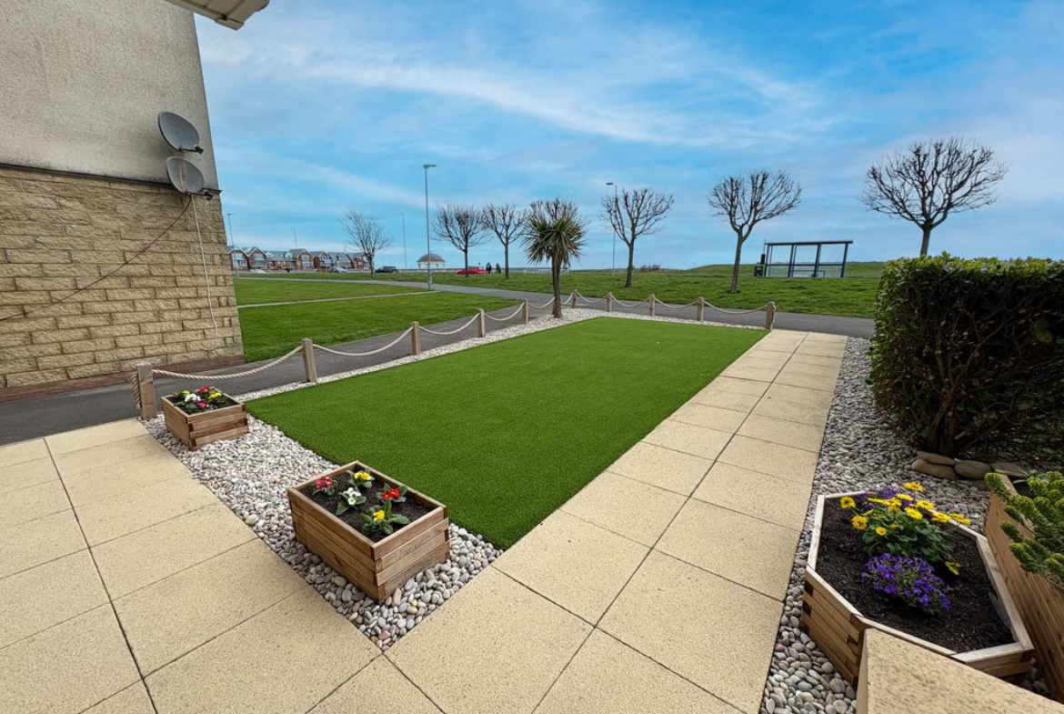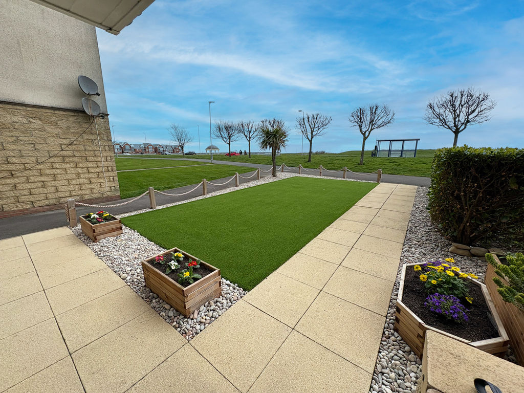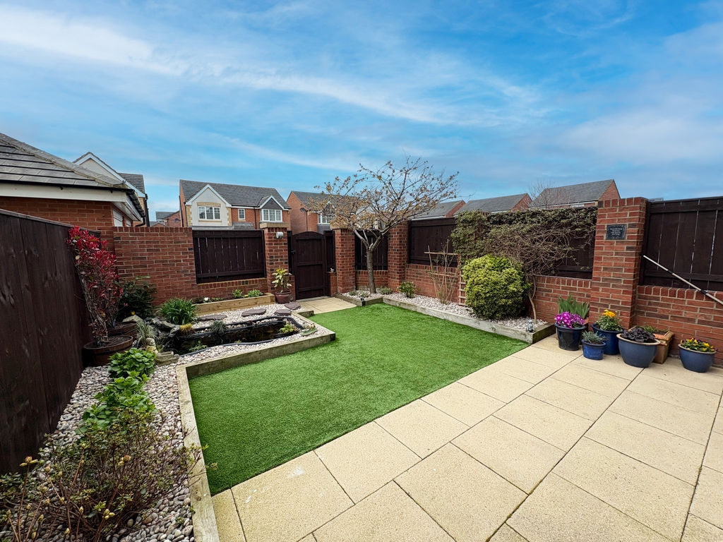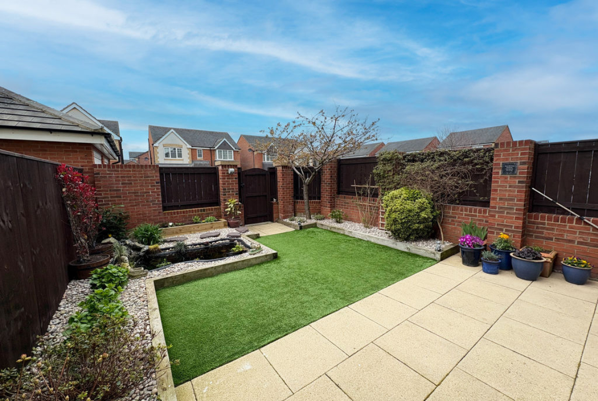 EXTERNALLY: to the rear is astro turf, raised beds and a patio area as well as gate to rear garage. To the front is also astro turf with stone borders and a path way.