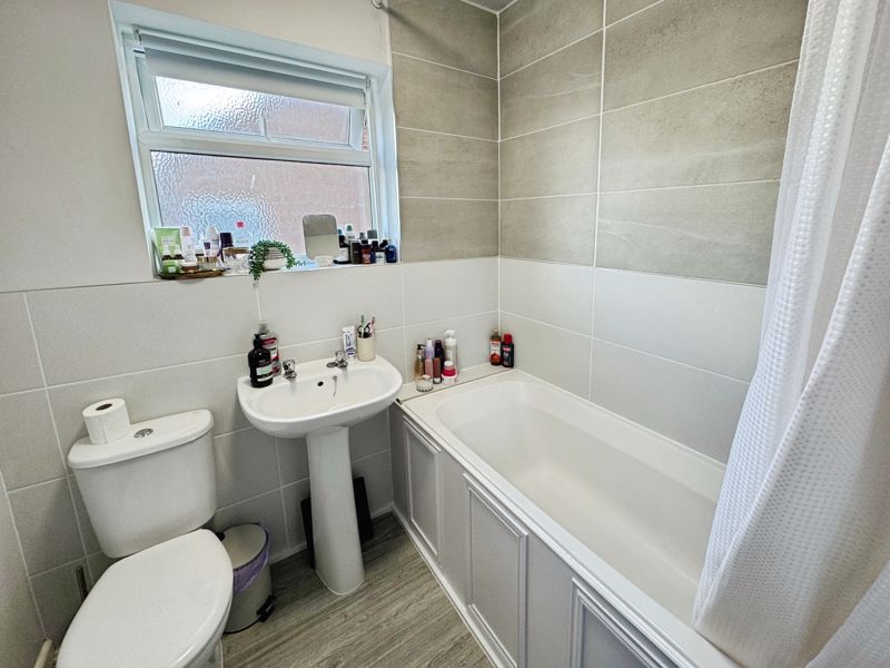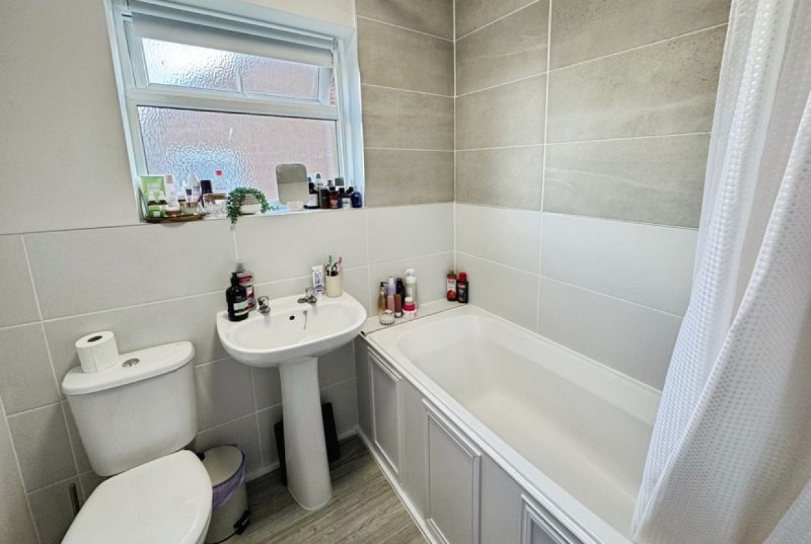 Part Tiled, bath with shower over, low level WC, Wash basin, heated towel radiator and UPVC window