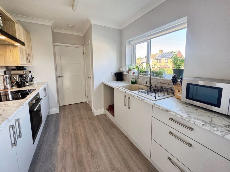 Complimenting wall and base units with tiled splashback, sink and drainer, large pantry cupboard, UPVC window and vertical radiator