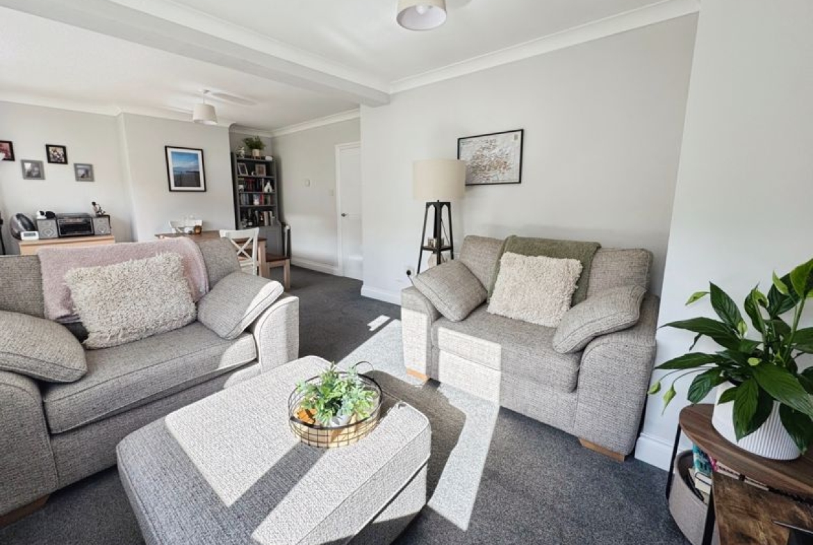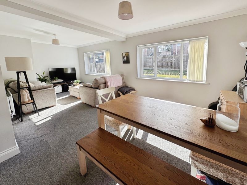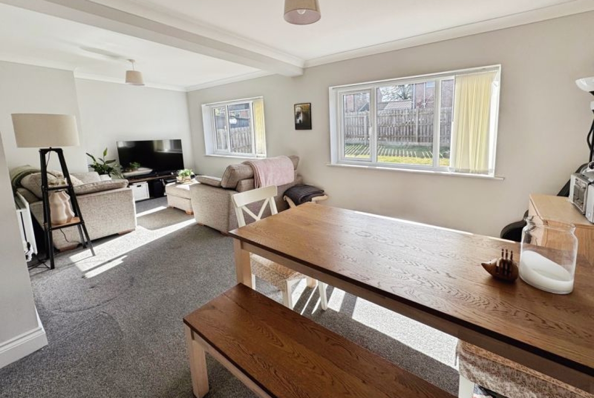 Upon entering, the home welcomes you into a spacious reception room that features large windows allowing plenty of natural light and offering pleasant views over the rear garden. This area serves as both a living and dining space, making it ideal for relaxing or entertaining guests.