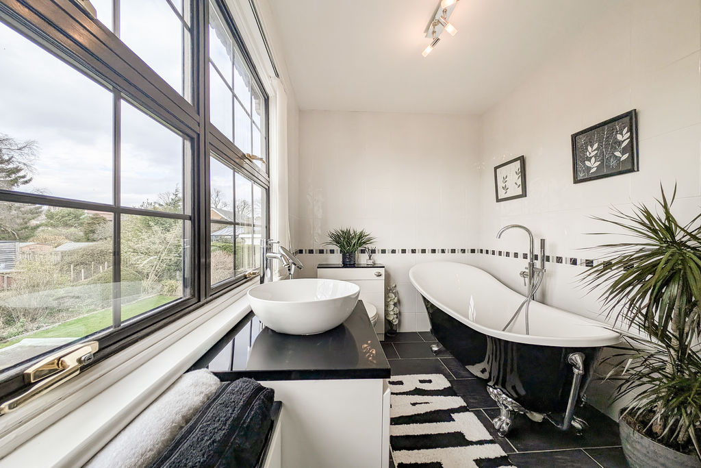 Freestanding slipper bath with claw feet and mixer tap with handheld attachment | Close coupled W.C. with concealed cistern | Fitted cabinets and drawer unit with mono bowl sink | Fully tiled walls and floor | Chrome ladder style radiator | Double-glazed windows overlooking rear garden