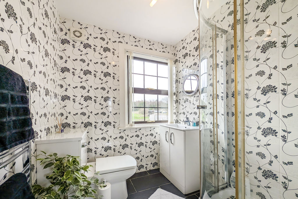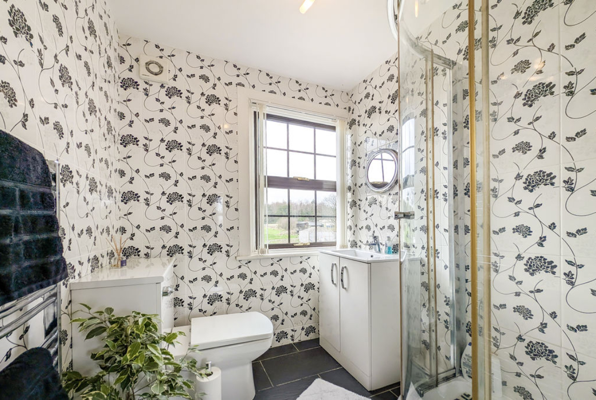 Tiled corner shower cubicle with mains shower | Close coupled W.C with concealed system | Cabinet with wash-hand basin | Chrome ladder style radiator | Fully tiled walls and floor | Double-glazed window overlooking rear garden