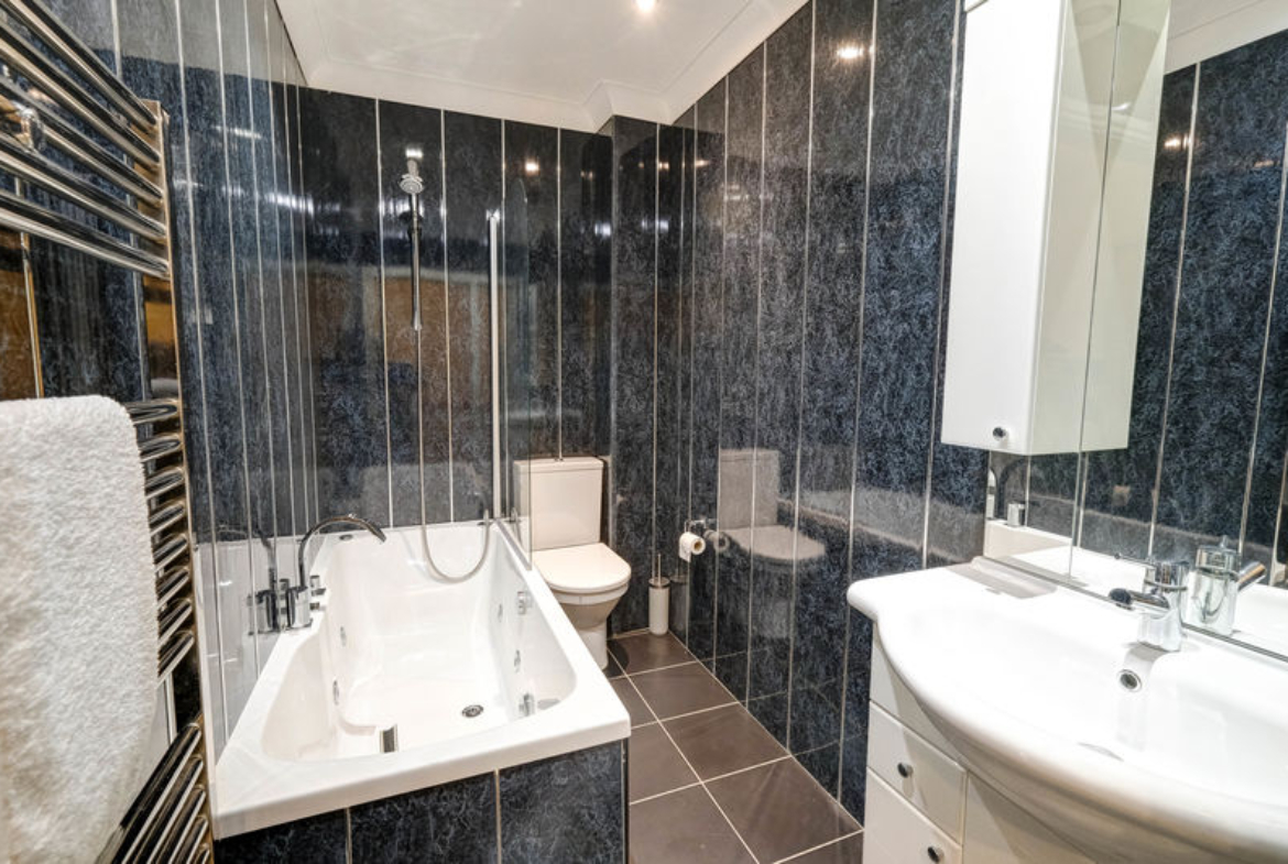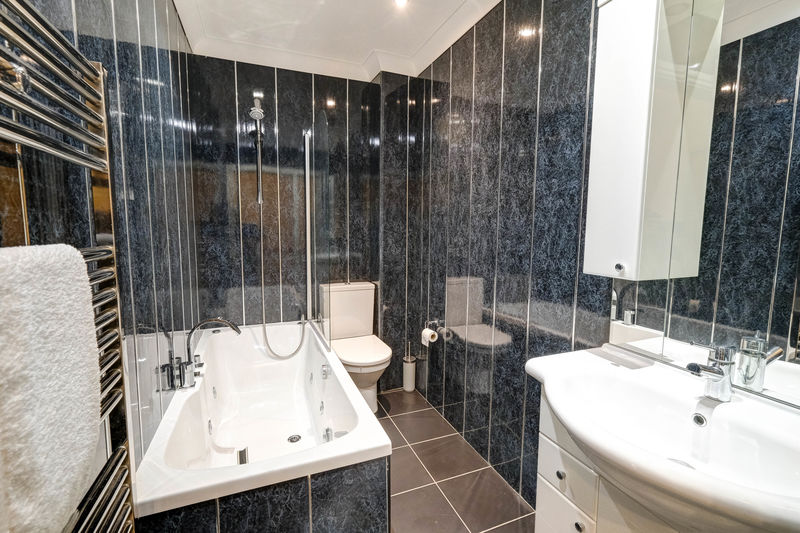 Jacuzzi bath | Close-coupled W.C. | Vanity unit with integrated wash-hand basin and mirror with feature lighting | Chrome ladder-style radiator | Wet-wall panelled walls | Tiled floor | Shaver point | Extractor