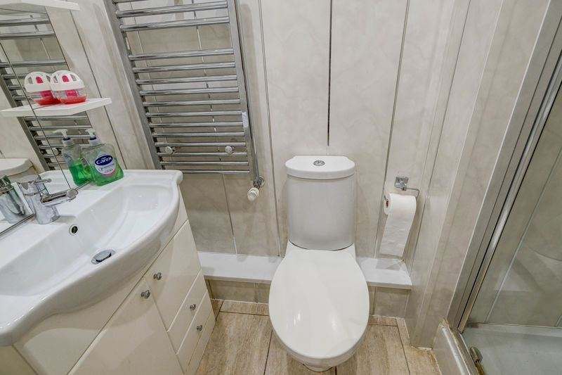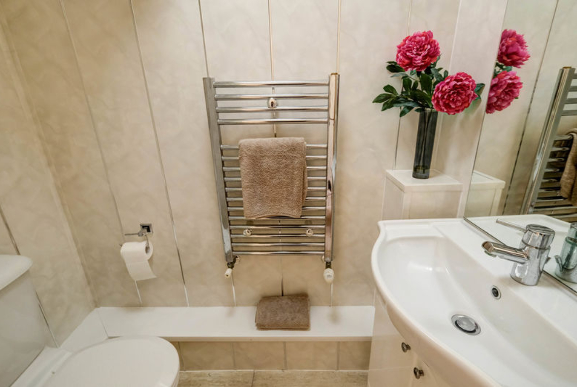 Shower cubicle with a mains powered shower | Vanity unit with integrated wash-hand basin and mirror with feature lighting | Close-coupled W.C. | Wet-wall panelled walls | Chrome ladder-style radiator | Shaver point | Extractor | Tiled floor
