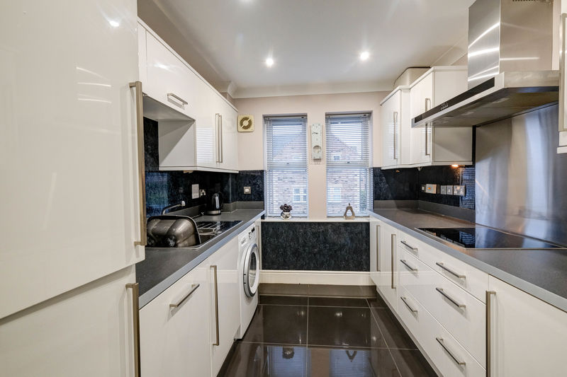 Kitchen area with fitted cabinets incorporating; 1.5 stainless steel sink, fridge-freezer, electric oven, microwave, induction hob and extractor, dishwasher, space for washing machine