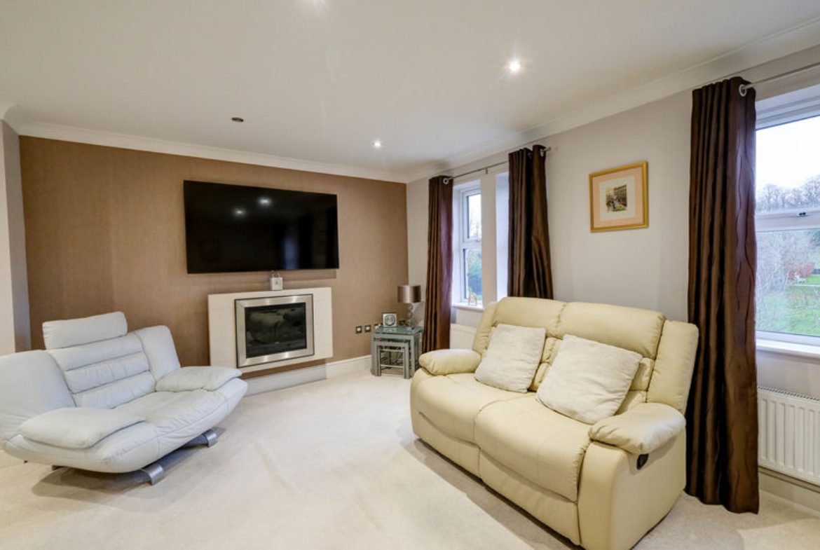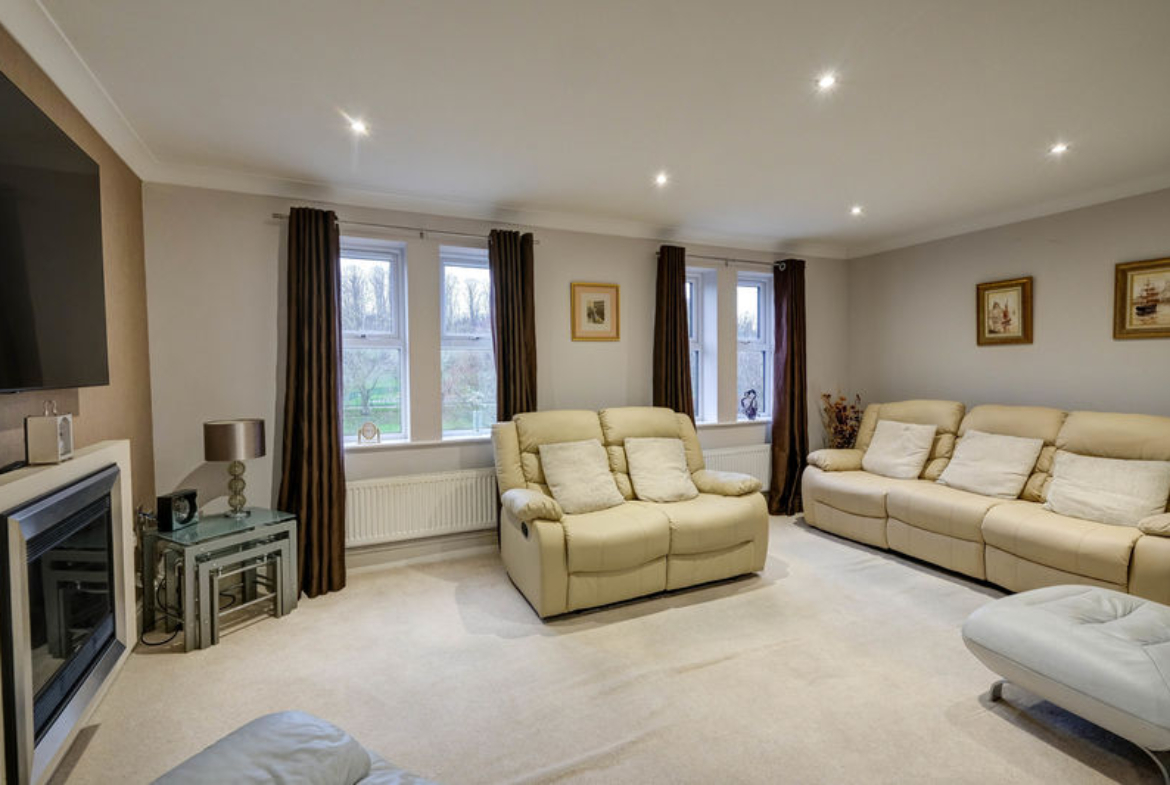 UPVC double-glazed windows overlooking rear garden and green space beyond | Electric fire | Ceiling downlights | Open to dining area