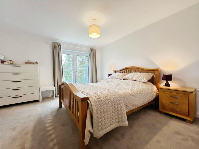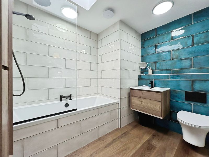 The master bedroom includes an en-suite, built-in wardrobes, French doors with Juliet balcony and garden views. A further three double bedrooms are provided, one with built-in wardrobes and another with a walk-in closet. The main bathroom offers feature tiling, a heated towel rail and skylight, with an additional en-suite to the primary bedroom. The property has an EPC rating of C and falls within council tax band E.