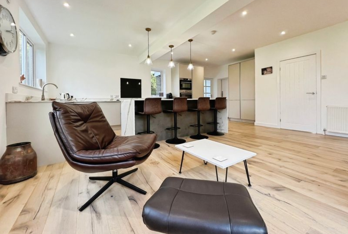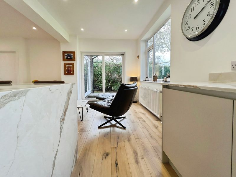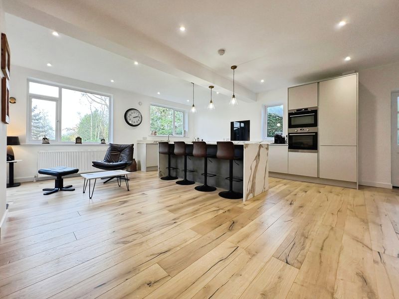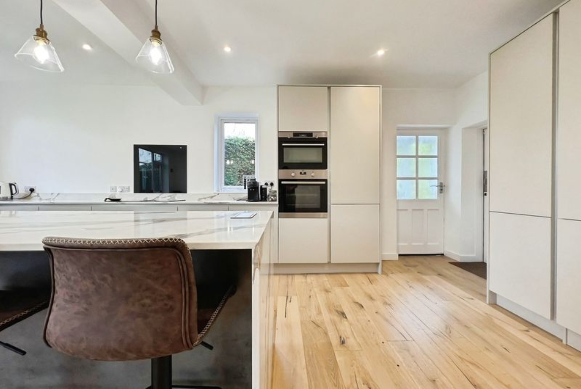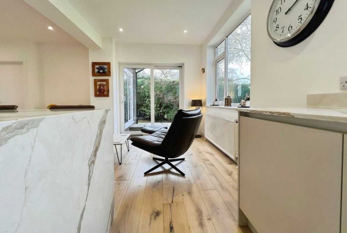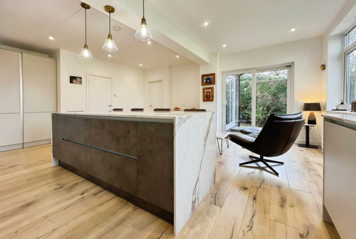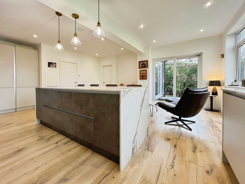 The fully renovated accommodation features one main reception room with large windows, a fireplace, feature wall panelling and views over the garden, along with access to a patio area. The open-plan kitchen is designed as the heart of the home, with a waterfall marble island, generous dining space, good natural light and direct access to both the garden and the garage.