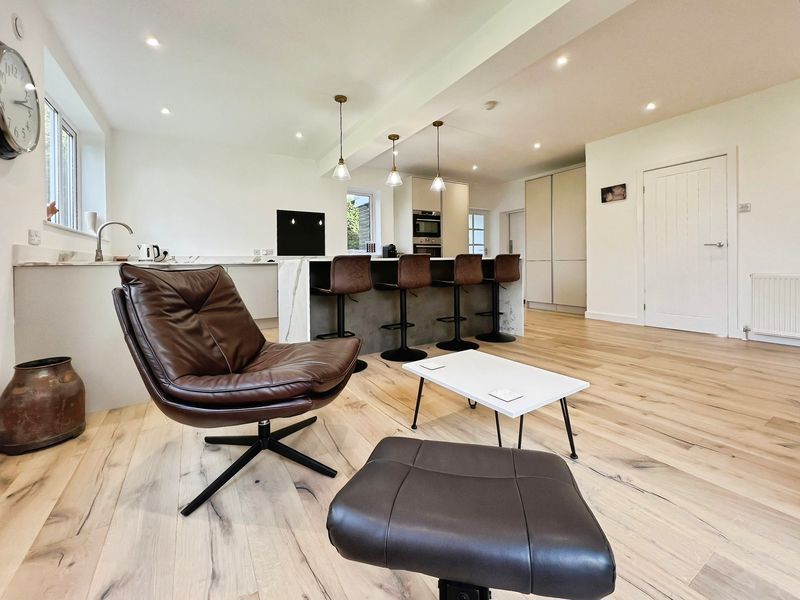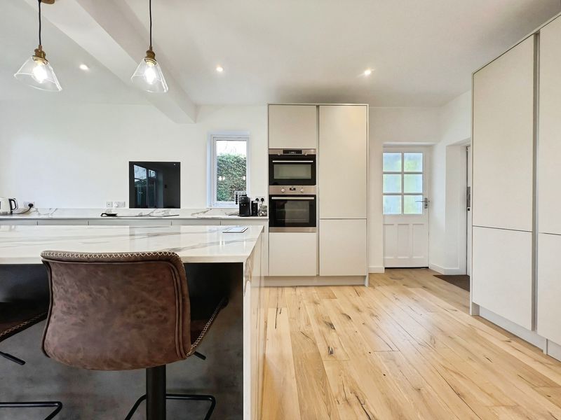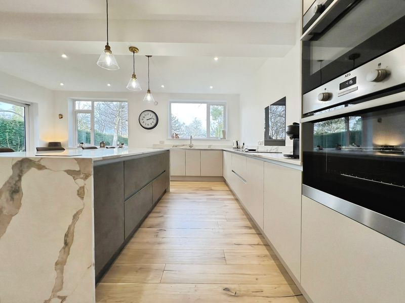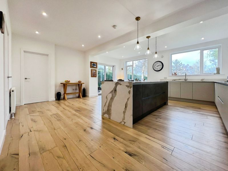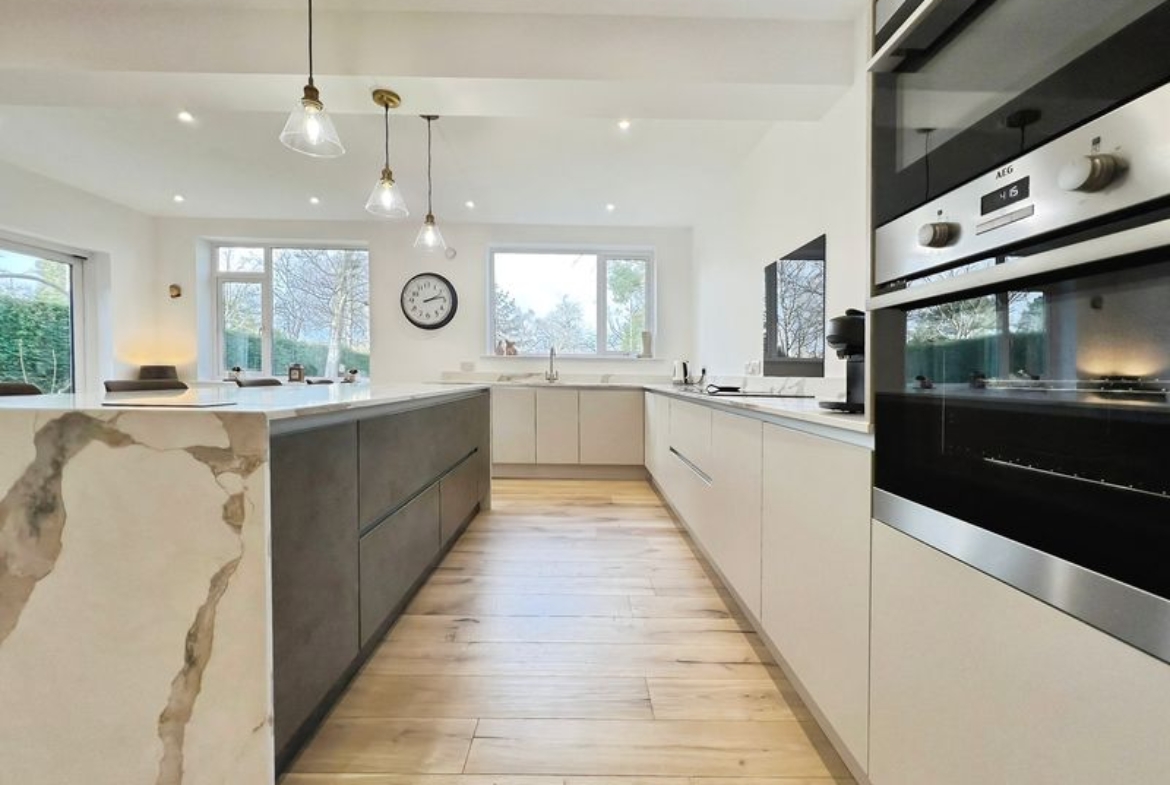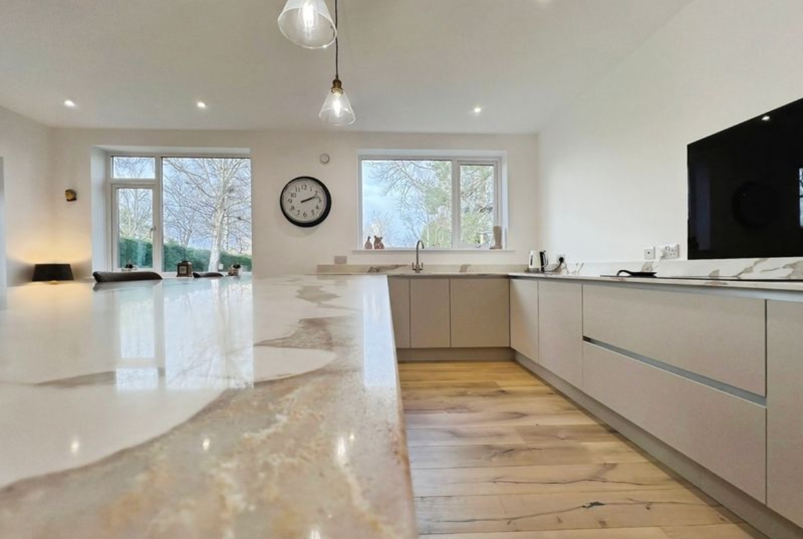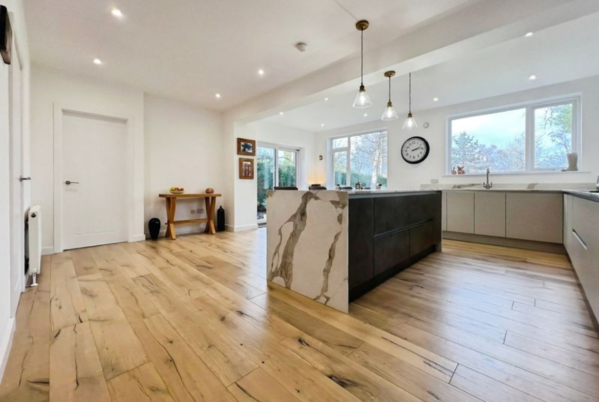 The fully renovated accommodation features one main reception room with large windows, a fireplace, feature wall panelling and views over the garden, along with access to a patio area. The open-plan kitchen is designed as the heart of the home, with a waterfall marble island, generous dining space, good natural light and direct access to both the garden and the garage.