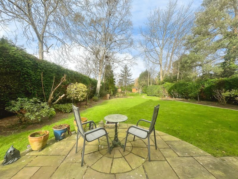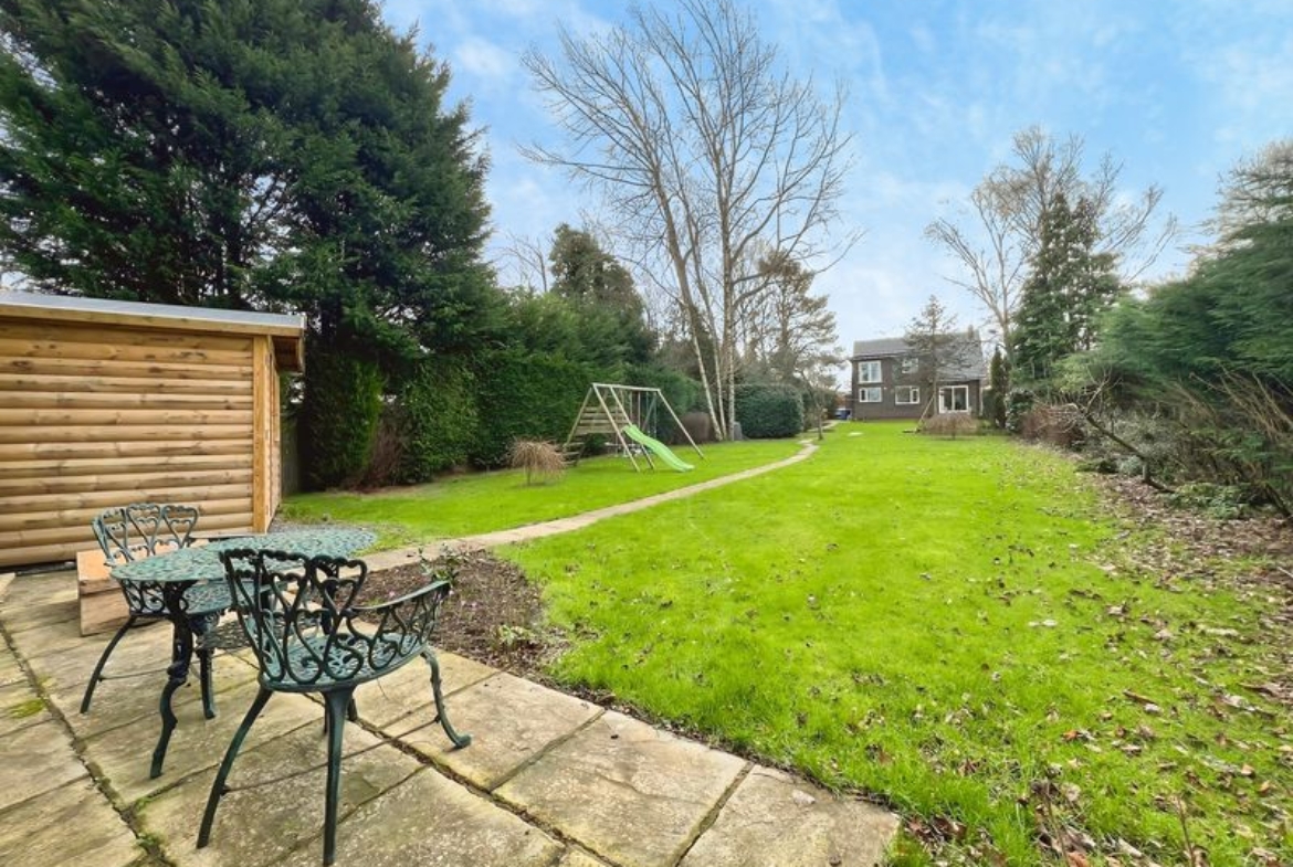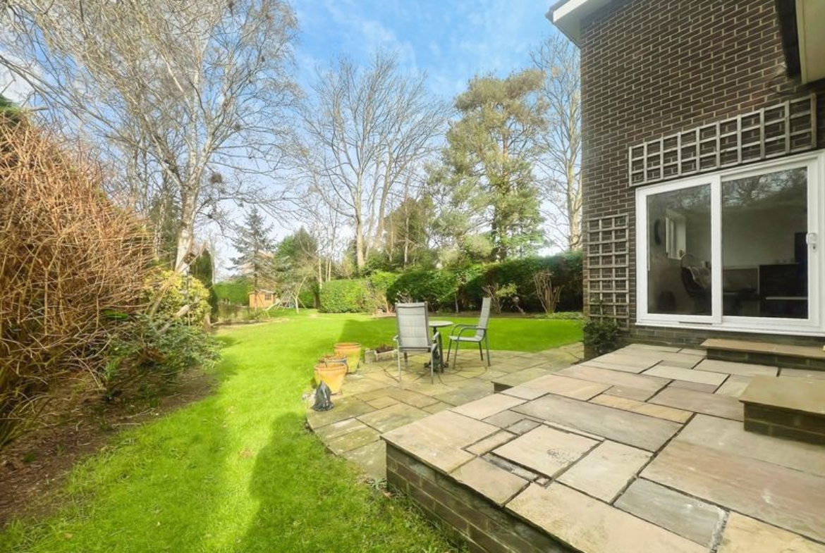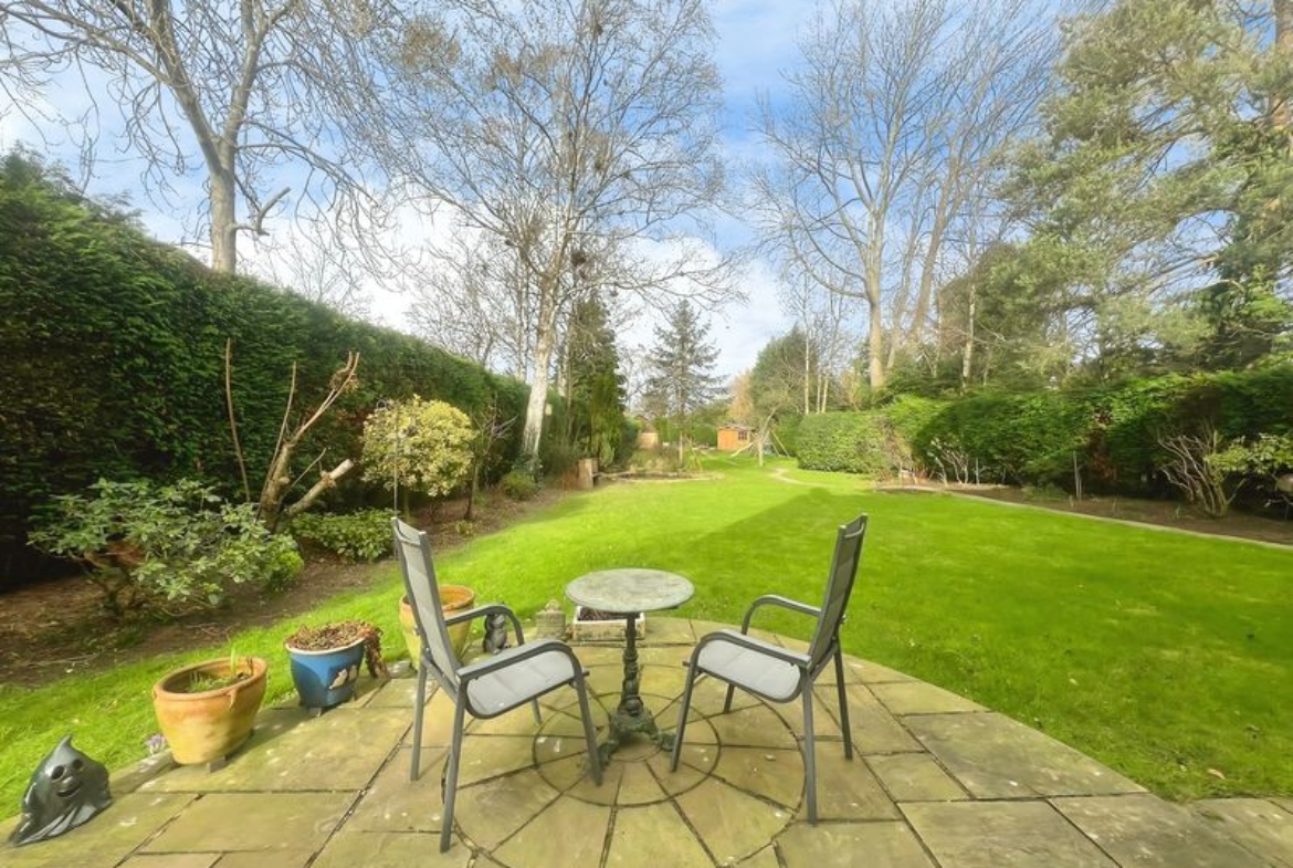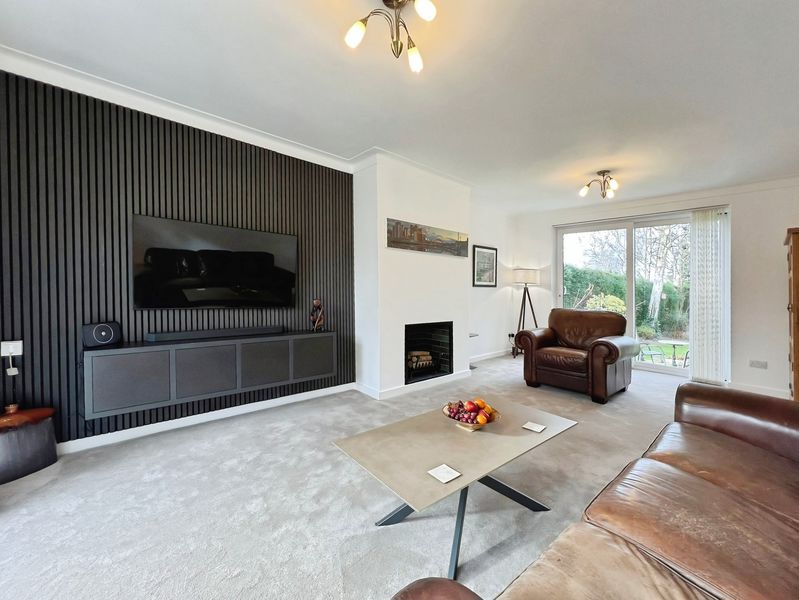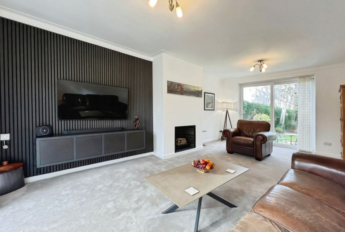 The fully renovated accommodation features one main reception room with large windows, a fireplace, feature wall panelling and views over the garden, along with access to a patio area. The open-plan kitchen is designed as the heart of the home, with a waterfall marble island, generous dining space, good natural light and direct access to both the garden and the garage.