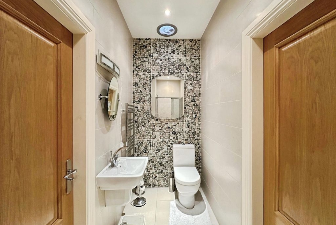 Ascending to the first floor, the landing provides access to five well-proportioned bedrooms, finished with modern décor throughout. The principal bedroom is a vast space that runs the full width of the property, featuring views to the front and rear. The principal bedroom comes complete with its own ensuite bathroom, which has been finished with a free-standing bath tub, separate shower, basin and W.C. The second bedroom is well-sized making it the ideal guest room, which comes complete with large fitted wardrobes and its own ensuite bathroom, featuring a walk-in shower, wall mounted wash basin, W.C and inset ceiling spotlights. Two further double bedrooms share an opportune Jack & Jill en-suite, complete with a tiled shower enclosure, wall-mounted wash basin, WC, inset spotlights and an extractor fan. The first floor is complete with a well-designed dressing room, which comes with practical fitted wardrobes, this could be used a sixth bedroom to suit.