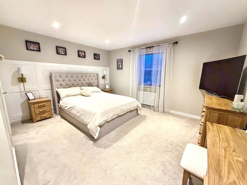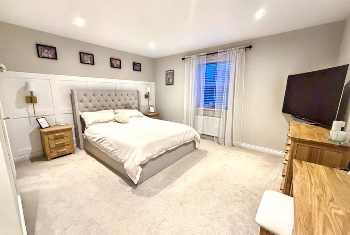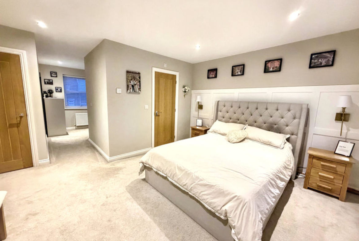 UPVC double-glazed window | Radiator | Three-quarter panelled wall | Wall lights | Door to En-Suite | Cupboard housing hot water cylinder| Open to dressing room