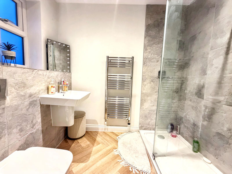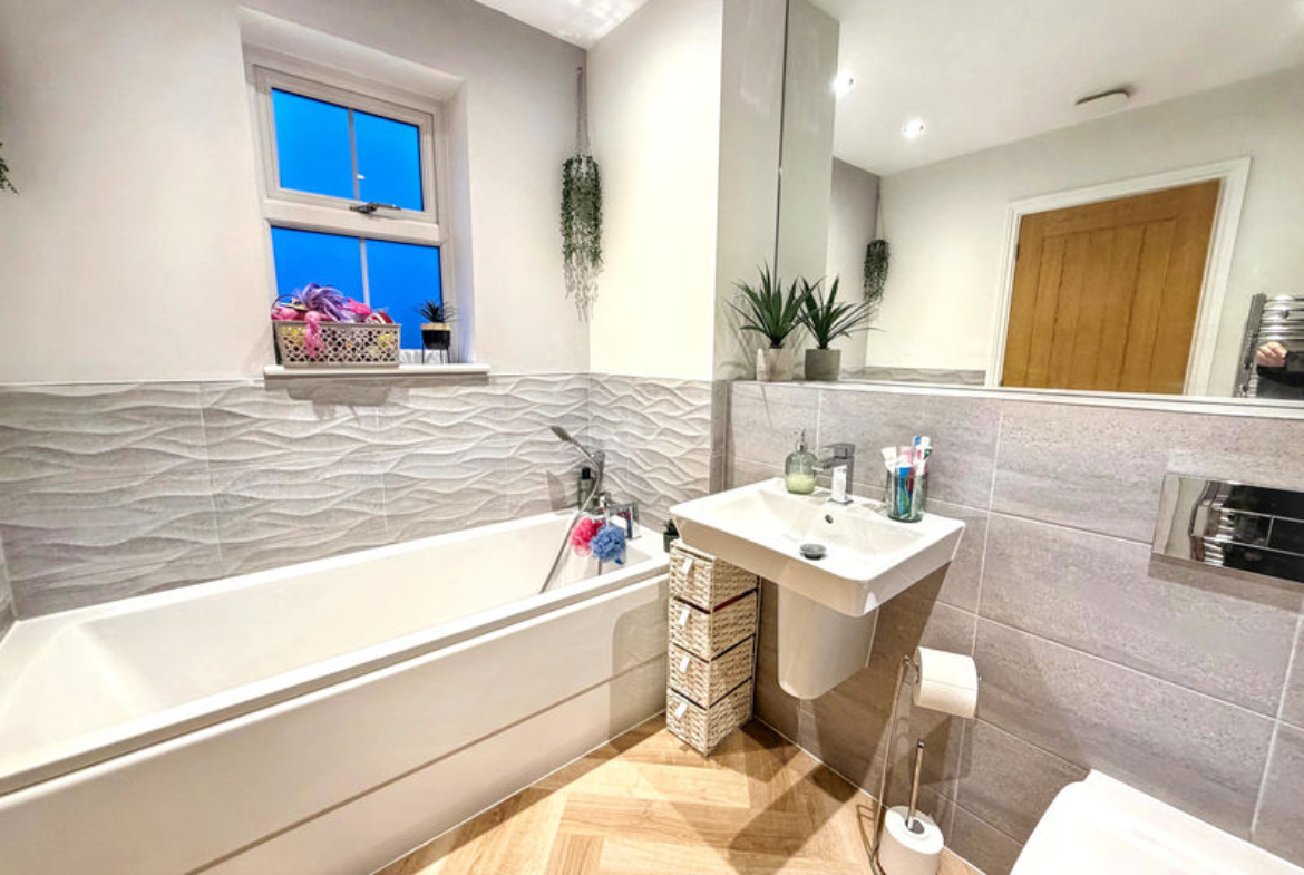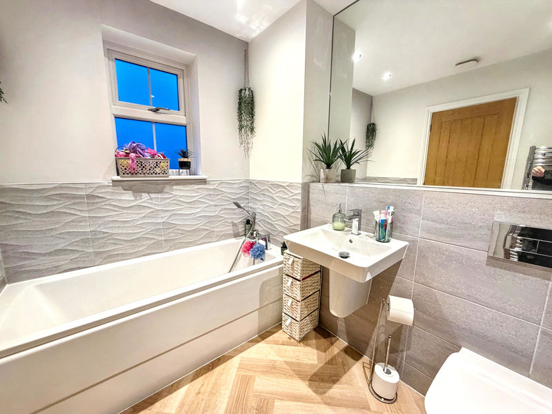 Bath with handheld shower attachment | Tiled shower cubicle incorporating a mains rainfall head shower & separate handheld attachment | Wall mounted wash-hand basin | W.C with concealed system | Part-tiled walls | Feature mirror wall | Ceiling downlights | Extractor | UPVC double-glazed frosted window | Chrome ladder style radiator