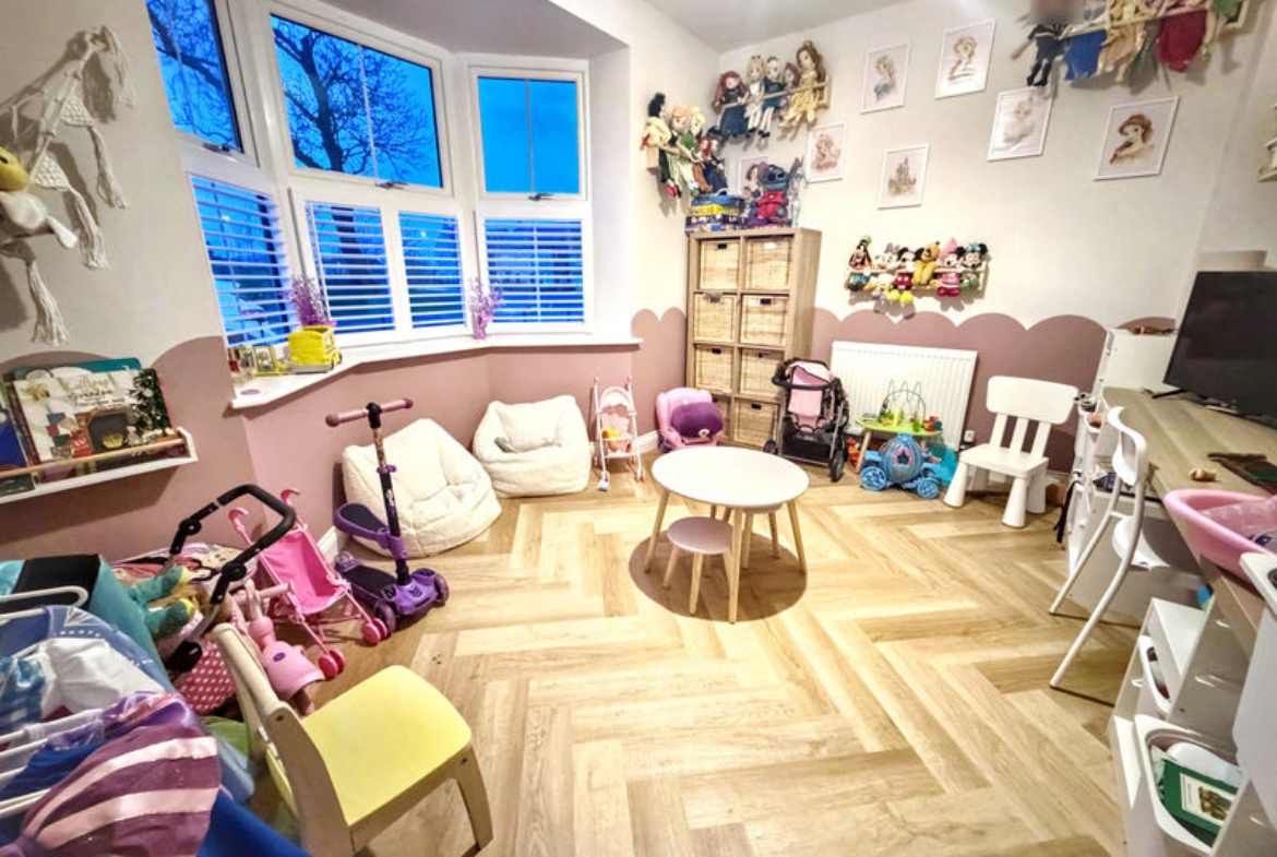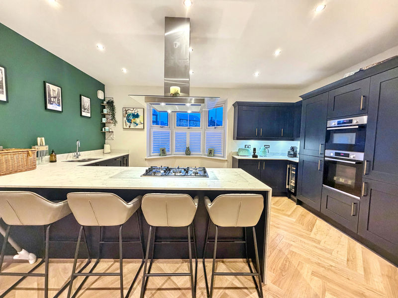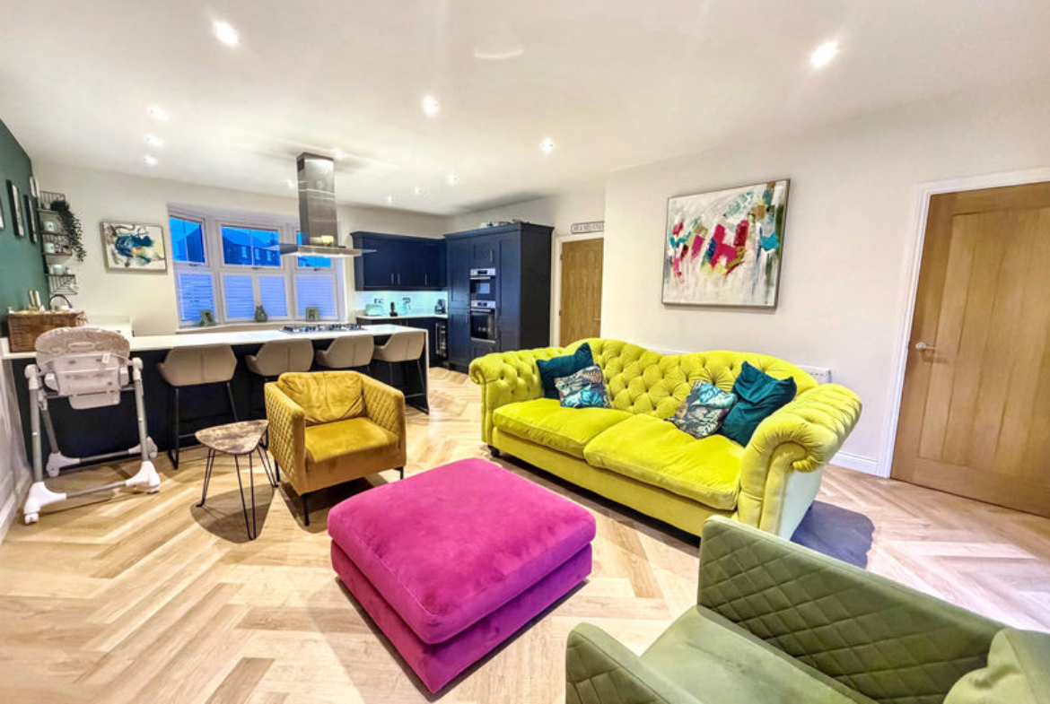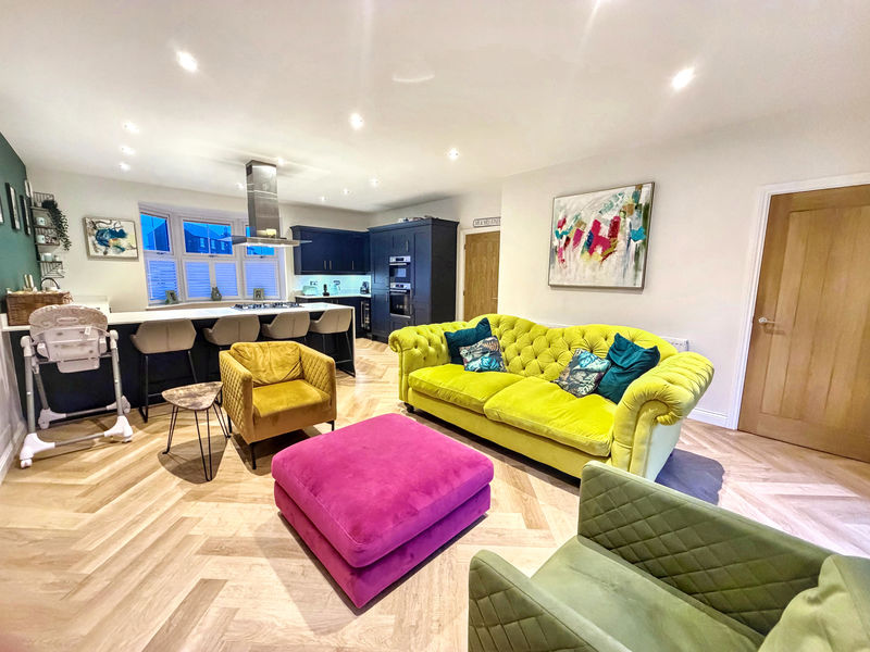 The property offers a spacious open-plan kitchen featuring a peninsula and a living area with bi-fold doors opening directly onto the rear garden, creating a superb everyday living and entertaining area. A separate living room with garden views and a further reception room currently used as a playroom, provide flexible living space. There is a useful utility room, and a double drive to the rear leads to a double garage with EV charging.