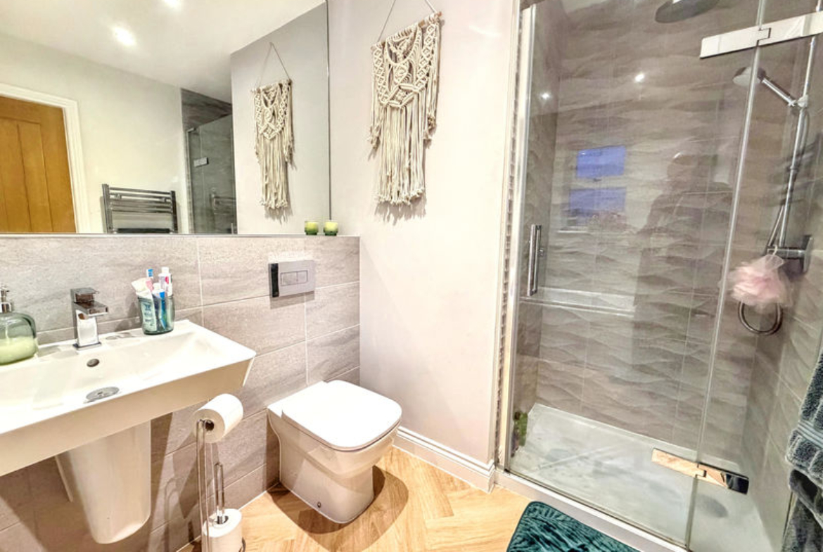 Walk-in tiled double shower cubicle with mains rainfall head shower & separate handheld attachment | Wall mounted wash-hand basin | W.C with concealed system | Chrome ladder style radiator | Part-tiled walls | Extractor | Ceiling downlights
