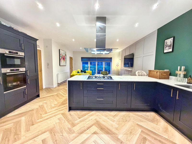 Double glazed bi-fold doors | Feature wood panelled wall | Radiator | Ceiling downlights | Door to utility | LVT flooring