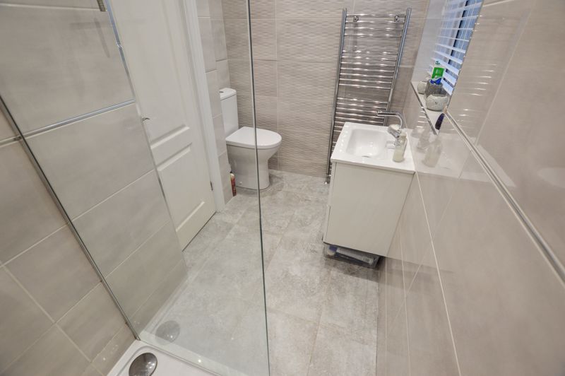 Walk in shower cubicle, wash hand basin set in vanity unit, Low level WC, heated towel rail, double glazed window to the side, tiled walls and flooring, spotlights