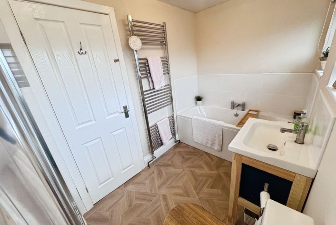 Two UPVC windows, bath with shower, vanity wash hand basin, low level wc and heated towel rail.