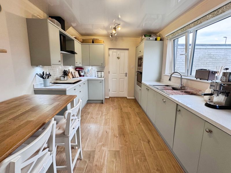 UPVC window, fitted with units incorporating one and a half bowl sink unit with drainer, plumbed for washing machine, access to garage and radiator.