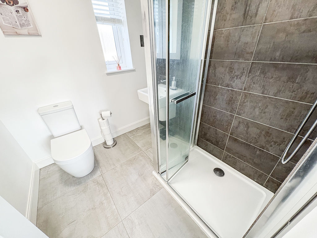 Both bathrooms are finished to a high standard, showcasing modern fittings, stylish tiling, and walk-in shower facilities, all designed to create a fresh and relaxing atmosphere. Outside, the property continues to impress with a generous garden that includes a well-kept lawn and a decked patio area, enclosed by secure fencing to provide a private and safe outdoor environment suitable for dining, entertaining, or children’s play.